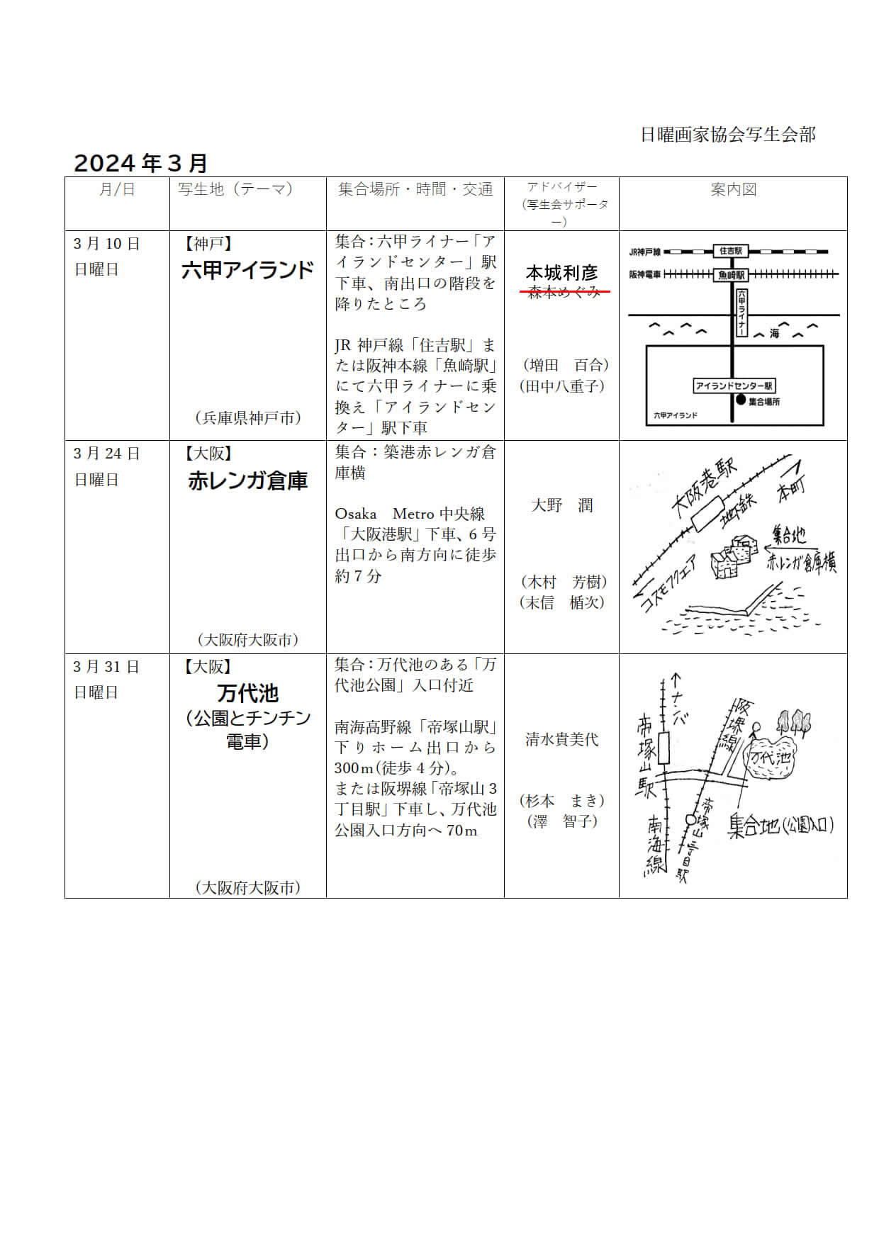 スケッチ会日程表(2024年1月、2月、3月)|日曜画家協会