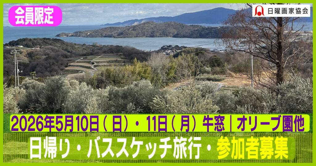 2026年5月10日(日)~2026年5月11日(月)日曜画家協会スケッチ会は「岡山県|牛窓|オリーブ園|ヨットハーバー」バススケッチ旅行です。スケッチ旅行へ一緒に出かけましょう。日常では出会えない景色に感動!そしてスケッチできる喜び!仲間とワイワイ話しながら楽しい時間をご一緒しましょう。講評会もあります。