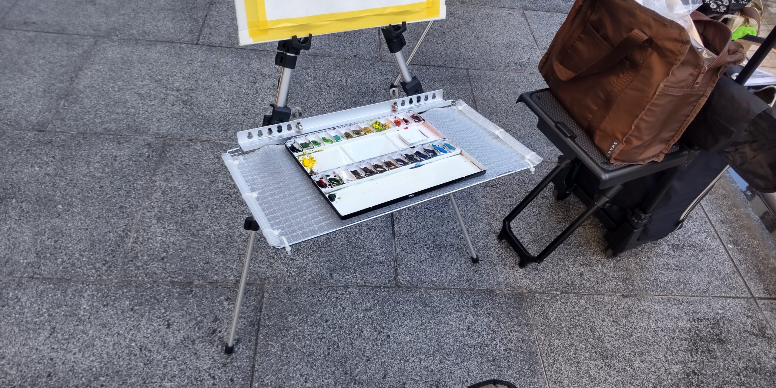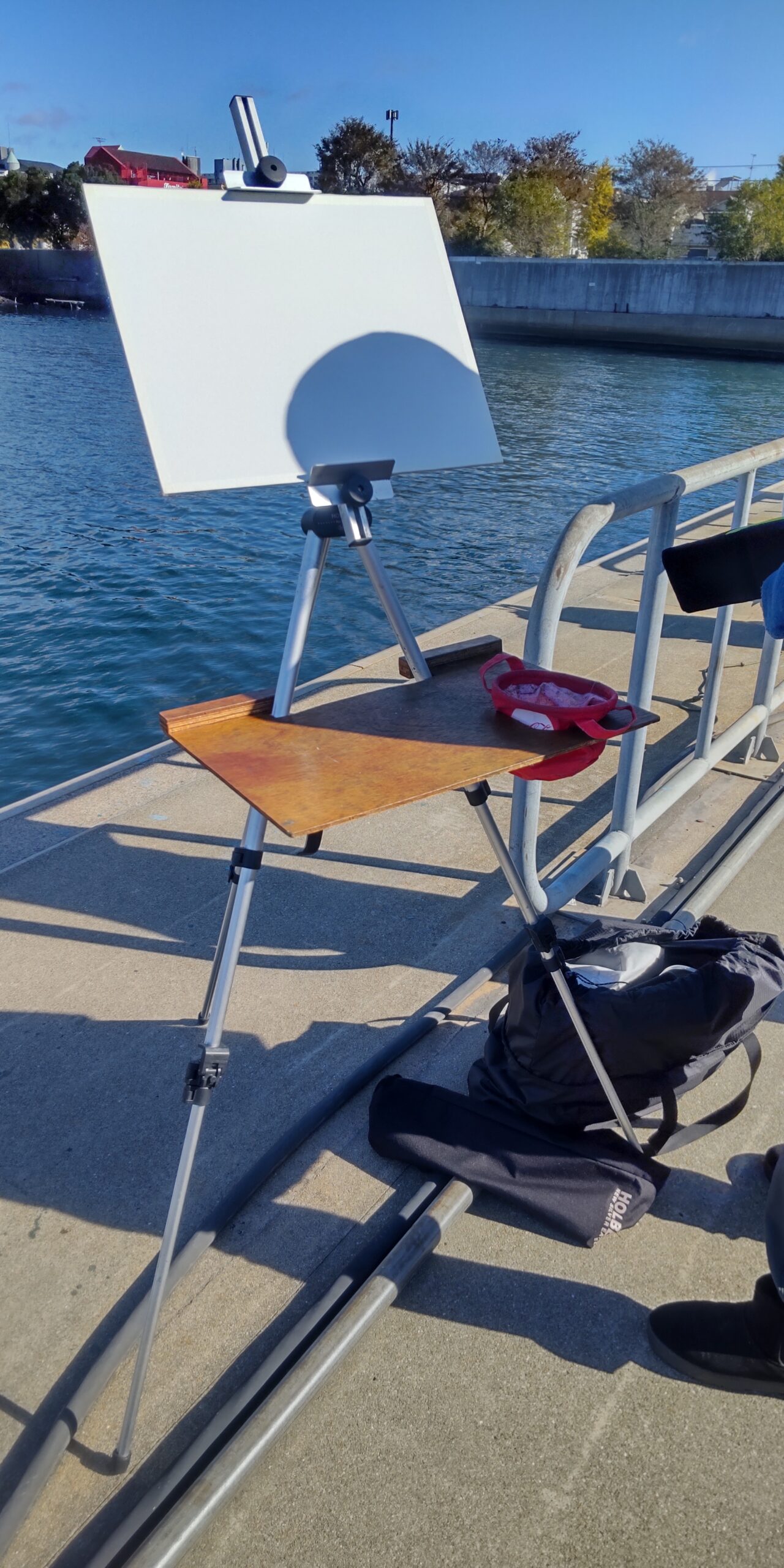 日差しが厳しい夏や秋、屋外スケッチで日陰がない場所があります。日傘は持っているけど、スケッチしながら日傘をさすのは難しいと思っていたら、イーゼルに傘を設置している会員さんを見つけました。お話を伺ったら工作が得意で自作されたそうです。カメラの部品を利用しているとのことでした。筆や水洗を置く台も機能的で充実していますね。傘があれば雨が降りそうなときも安心ですね、素晴らしい!