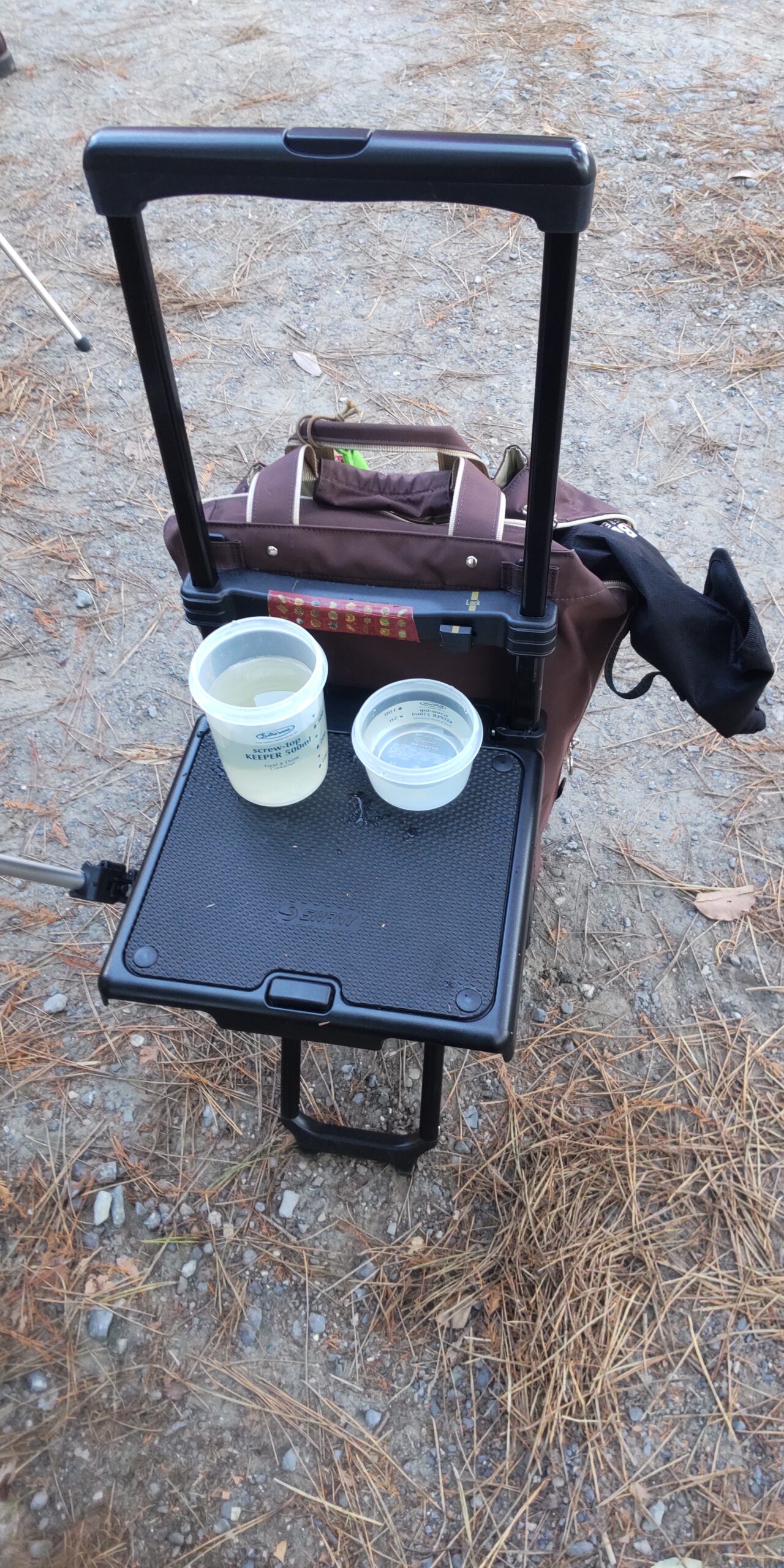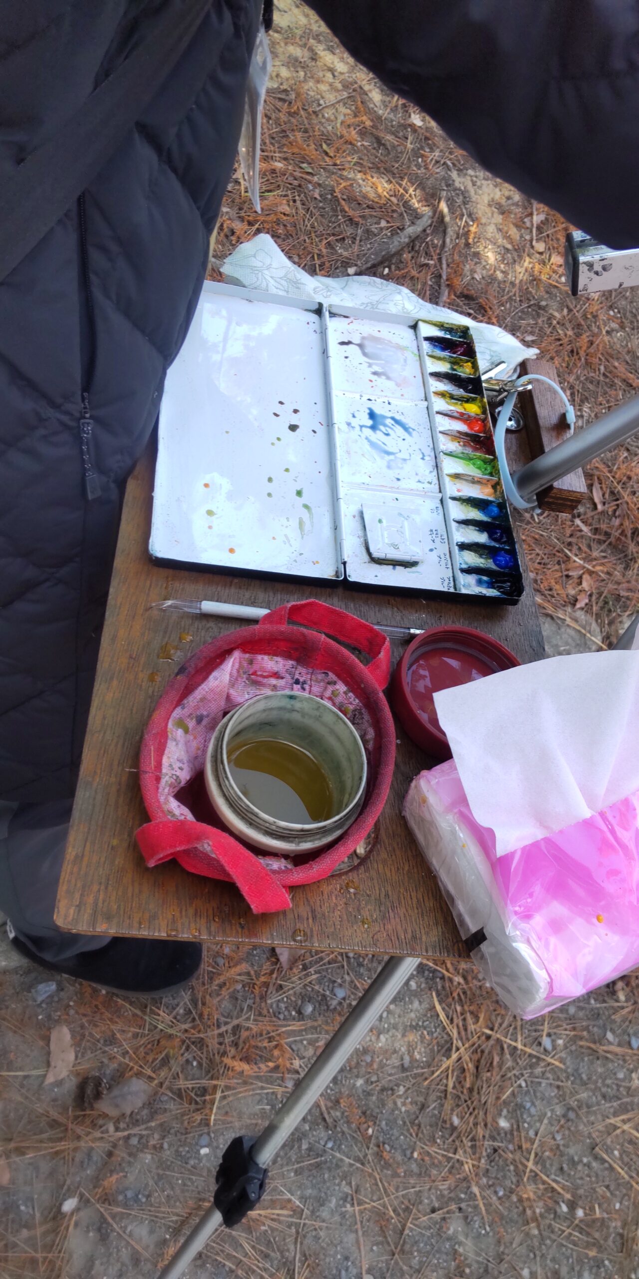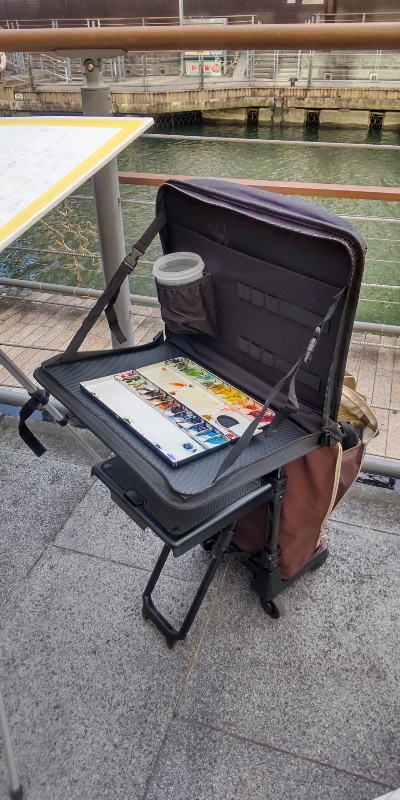 座面付きショッピングカートの座面にパレットや水入れを置いて使用してます。よくみなさんから「どこのメーカー?」って聞かれます、スワニー SWANY 30930 座面付きショピングカートです。立って描く場合はもう少し高さがあったほうが使いやすいので、持ち手のところにパソコンバッグ(車のハンドルに引っ掛けて使えるようになっていて、パソコン置いたりするそうです、送料込みで1600円ぐらいで購入しました)を引っ掛けて利用してますが、パソコンバック自体が少し重いのでもう少し改良できないか考え中です。