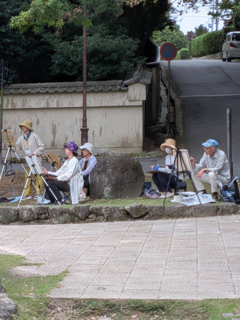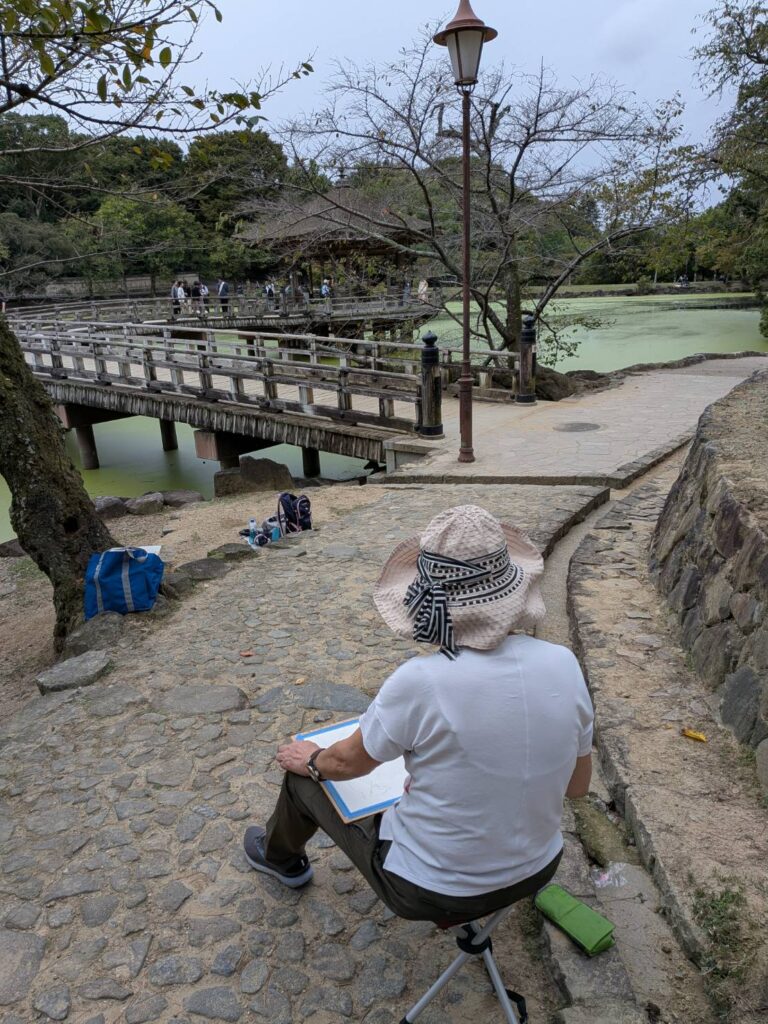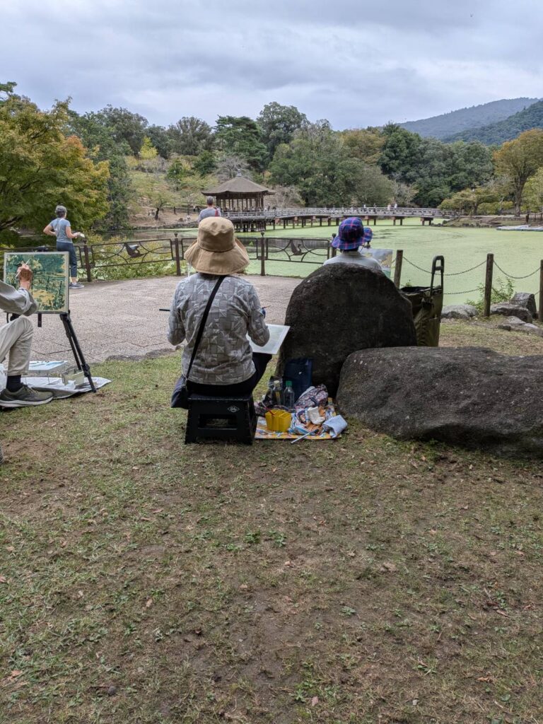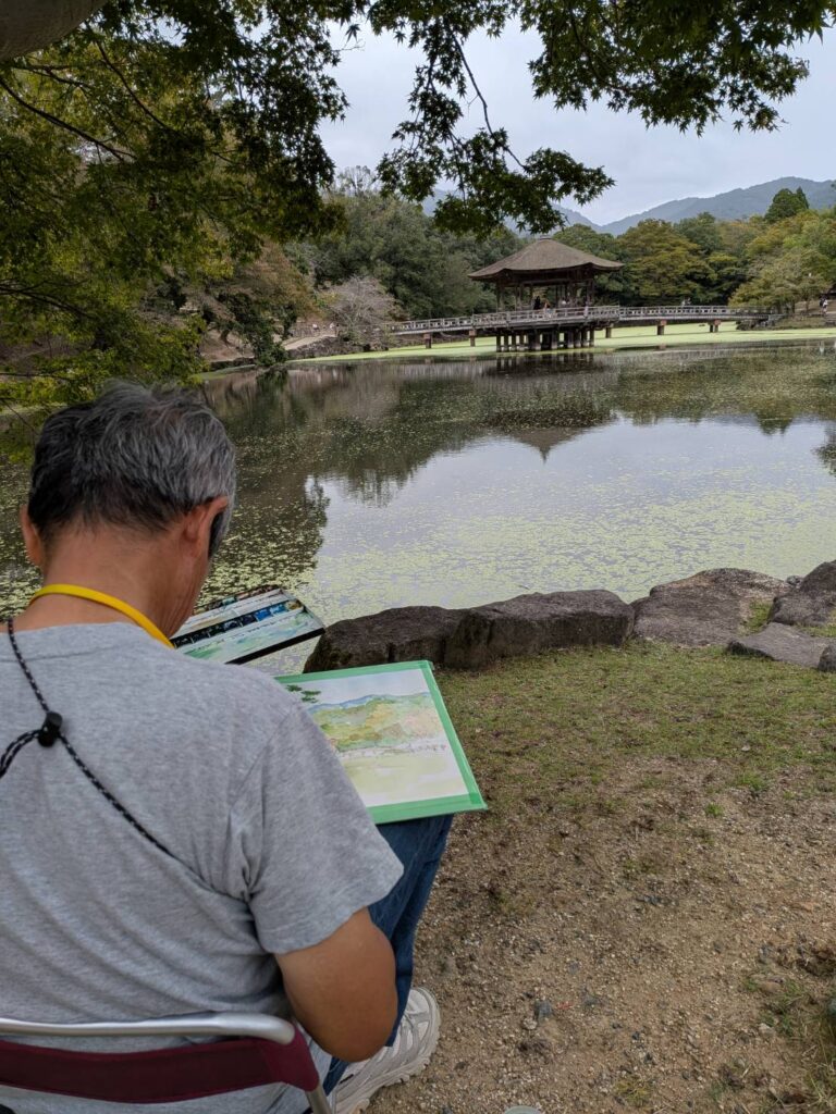 奈良浮見堂での写生会でした。大泉で雨に祟られたので、今回は大丈夫と何の根拠もない思いで皆様も参加されたのでは?浮見堂まで遠かったのでバスを利用した方、歩いてきた方 様々で10時に遅れた方もいましたが体験者1名、総勢40名の参加でした。11:30分頃、雨の襲来で突如解散の運びとなりました。ちなみにアドバイザーさんは雨男でした。残念、次回こそ! お一人新しく入会されました。みなさまお疲れさまでした