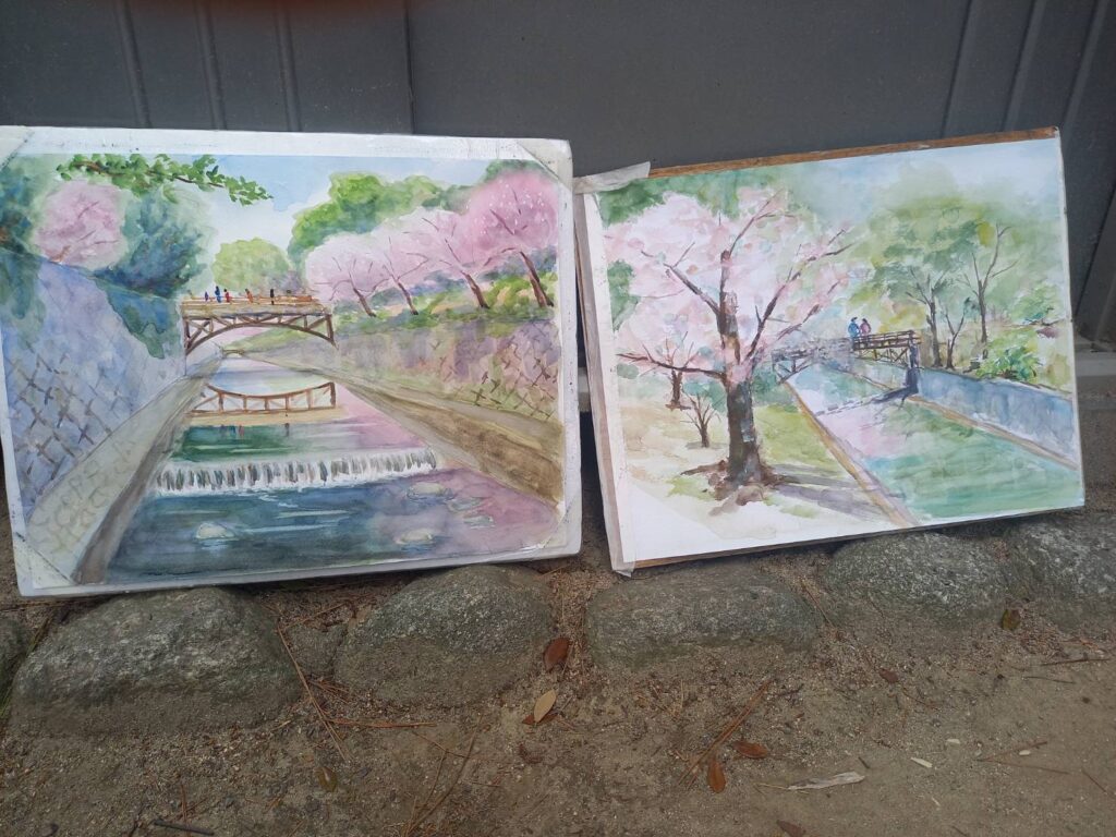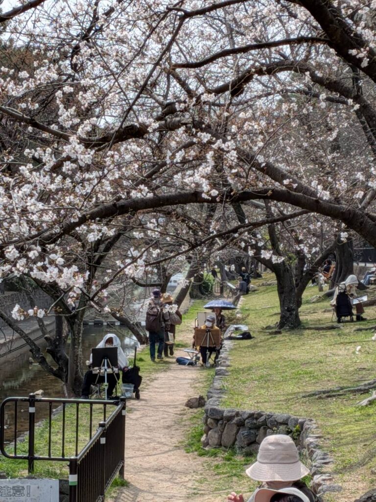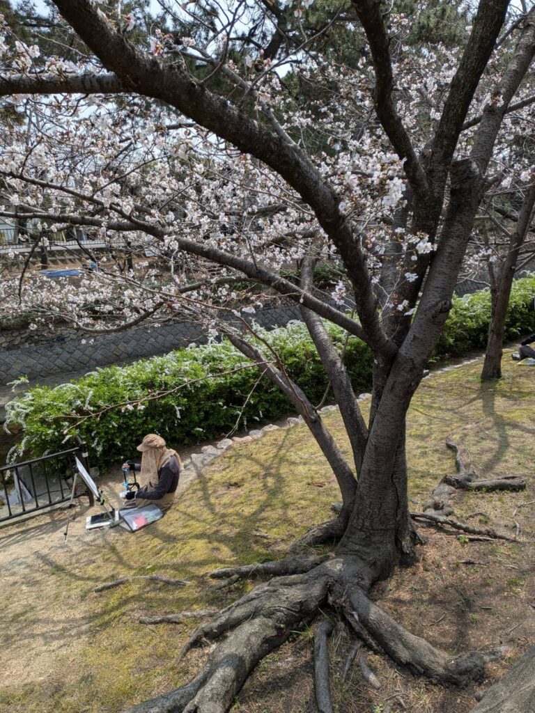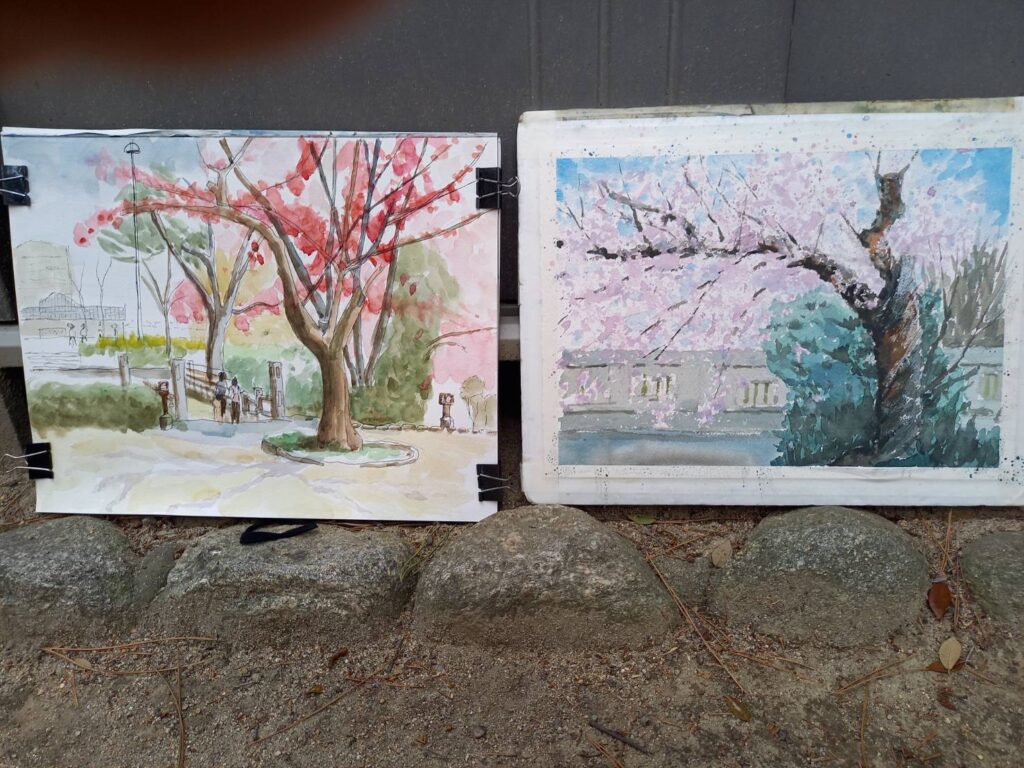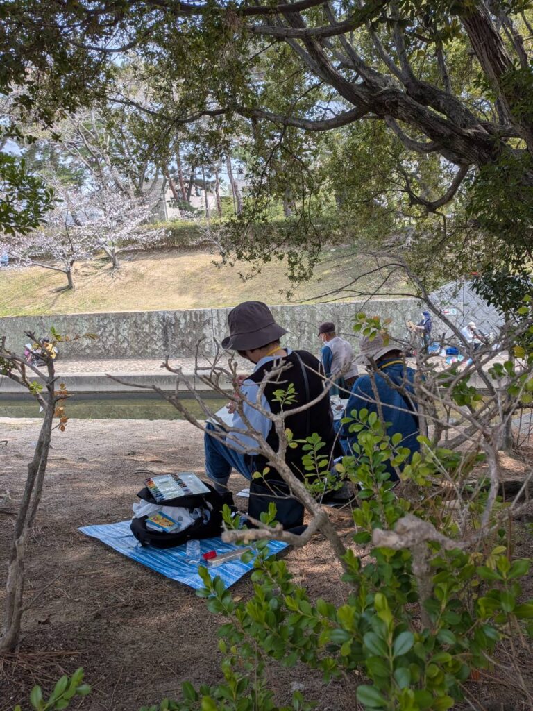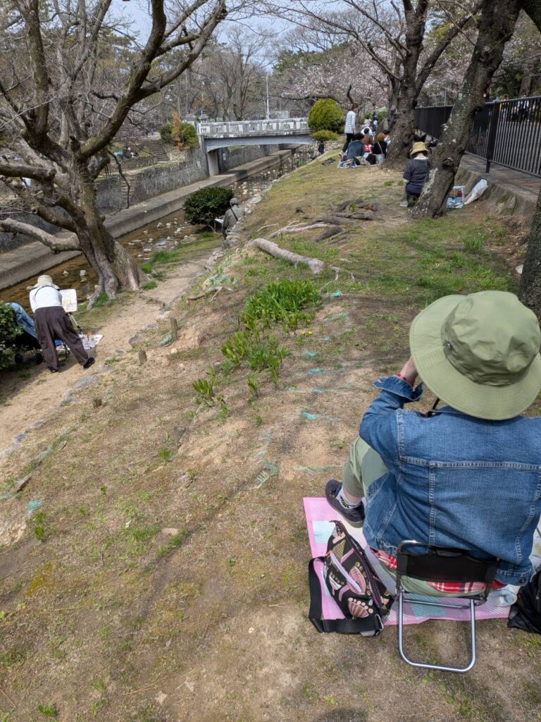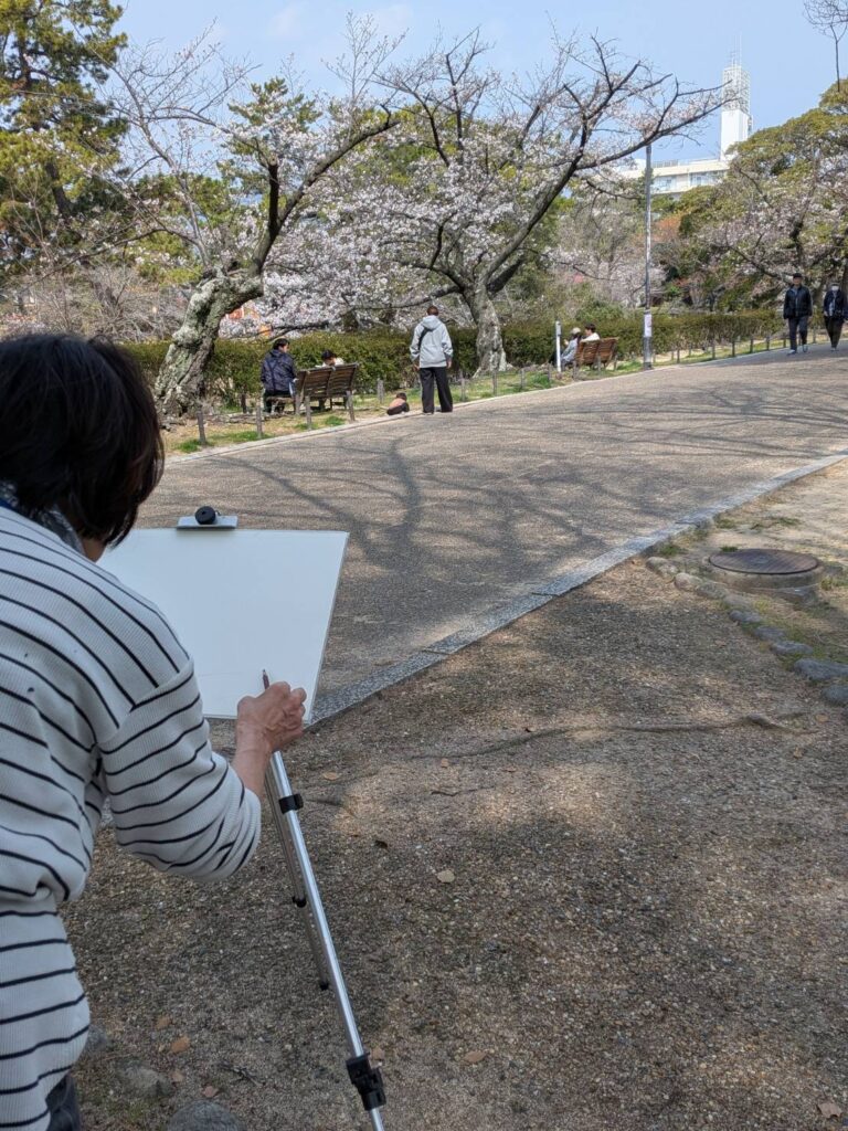 ニ、三日の好天で桜の開花も進み5分咲きと言ったところでしょうか。多くの参加者がここ香櫨園に集まりました。遠くは徳島からもいらしてくださり(2度目)総勢64名。花見客もさほど多くなく、迷惑かけないでスケッチを楽しめました。アドバイザーさんお疲れ様でした。