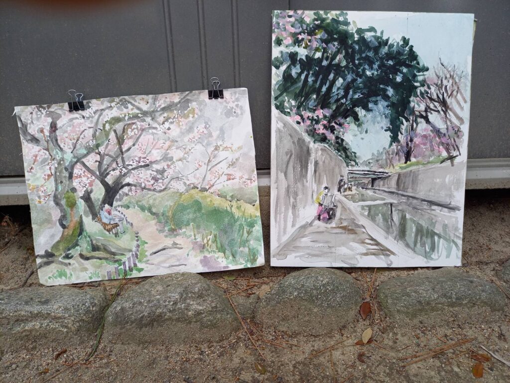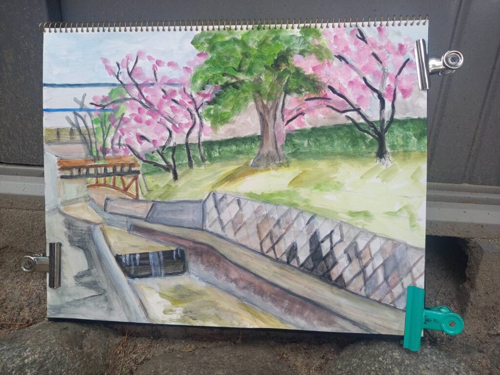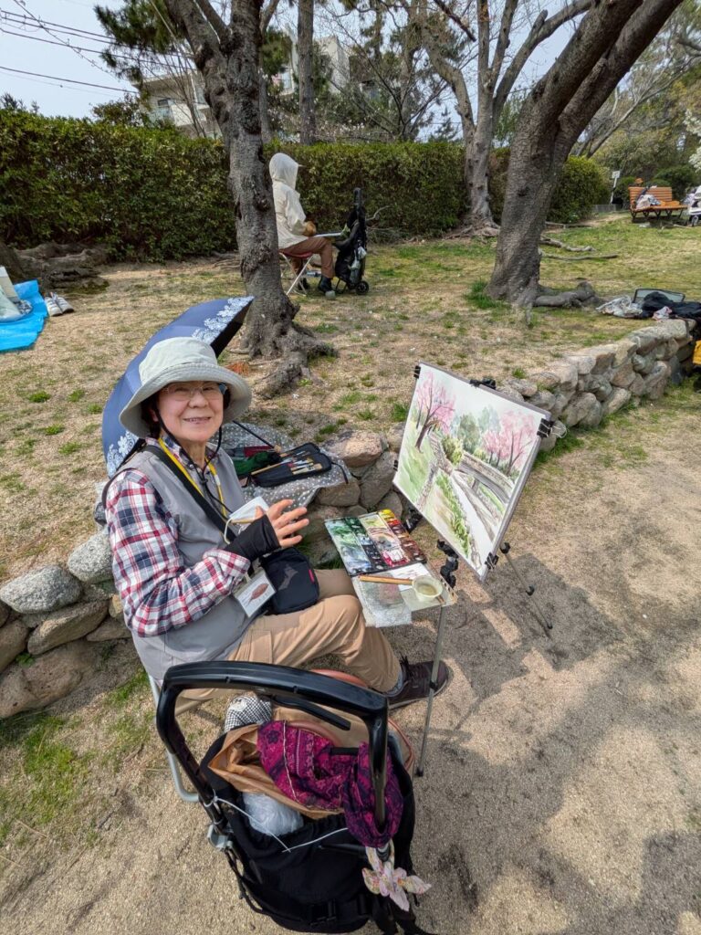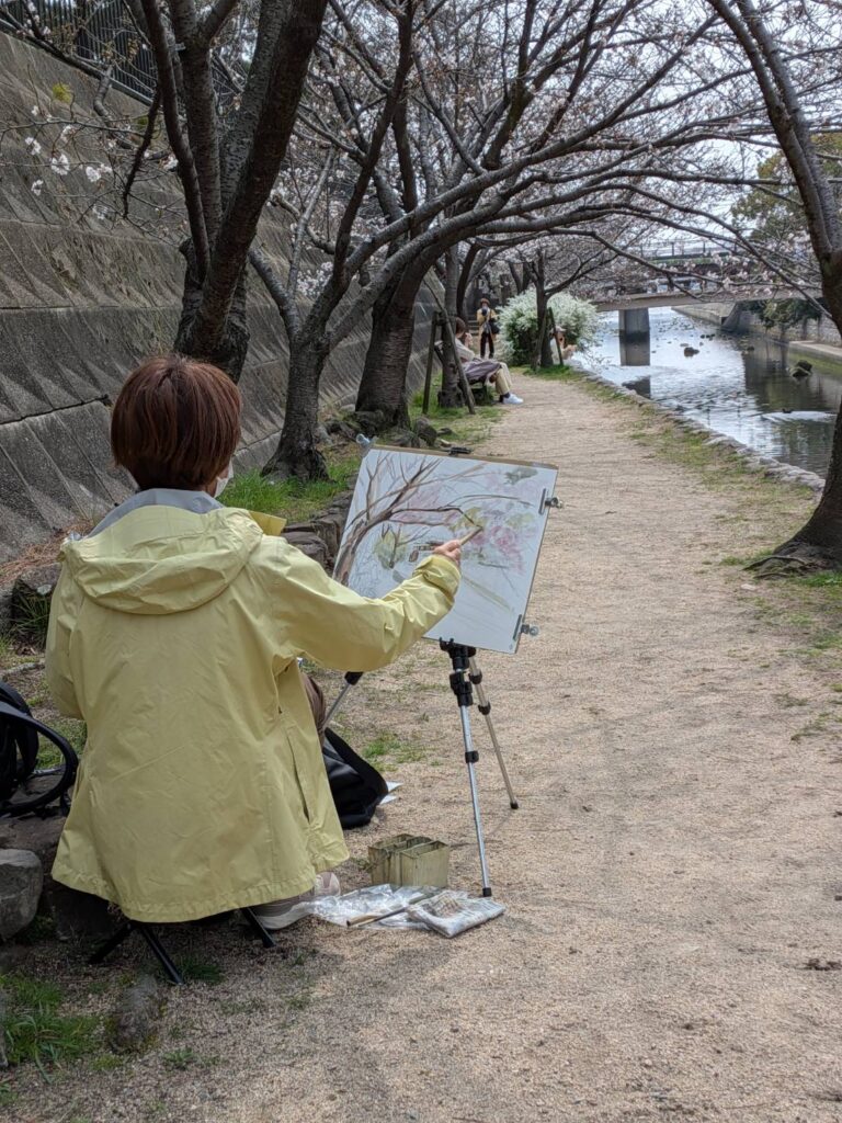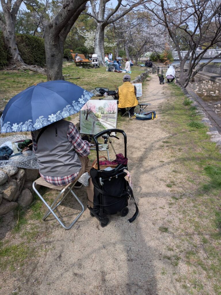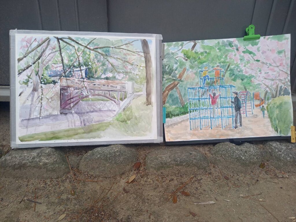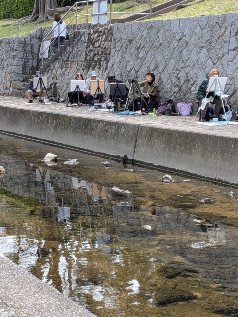 ニ、三日の好天で桜の開花も進み5分咲きと言ったところでしょうか。多くの参加者がここ香櫨園に集まりました。遠くは徳島からもいらしてくださり(2度目)総勢64名。花見客もさほど多くなく、迷惑かけないでスケッチを楽しめました。アドバイザーさんお疲れ様でした。
