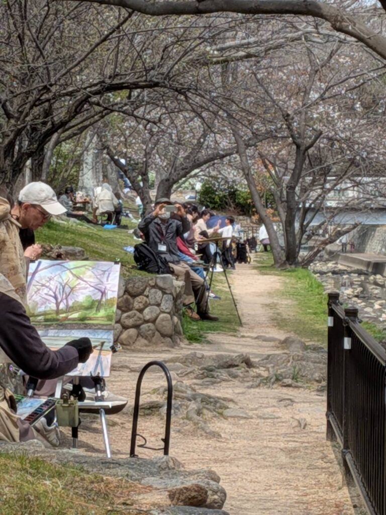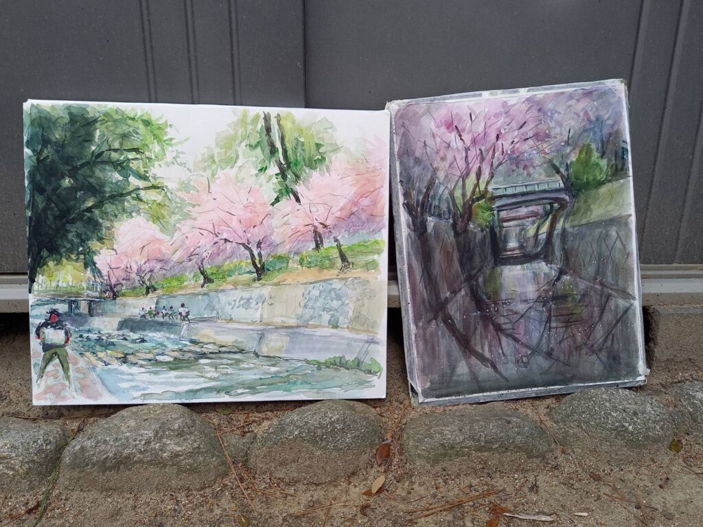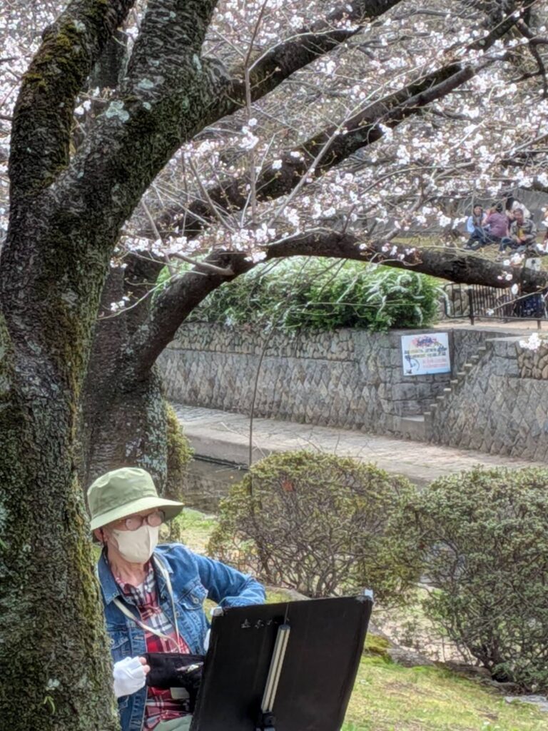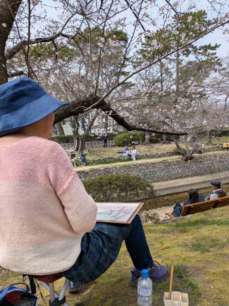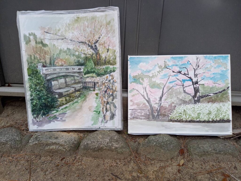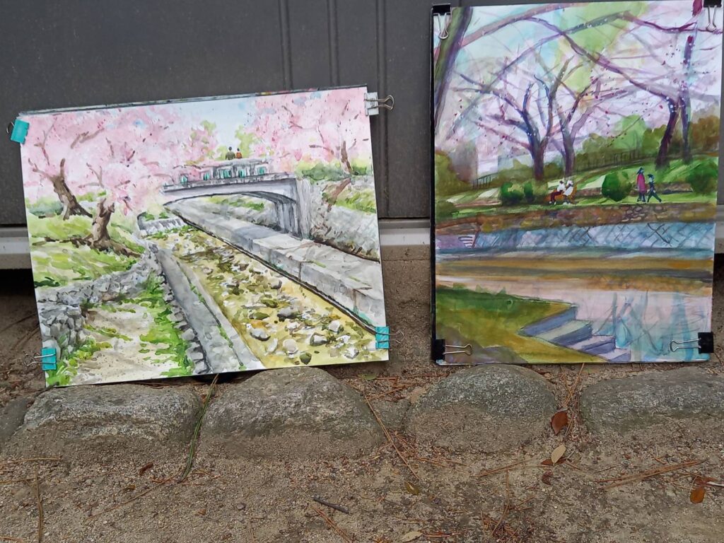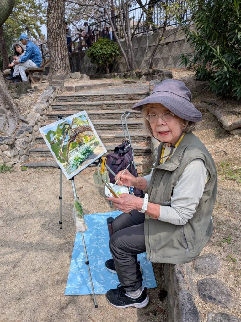 ニ、三日の好天で桜の開花も進み5分咲きと言ったところでしょうか。多くの参加者がここ香櫨園に集まりました。遠くは徳島からもいらしてくださり(2度目)総勢64名。花見客もさほど多くなく、迷惑かけないでスケッチを楽しめました。アドバイザーさんお疲れ様でした。