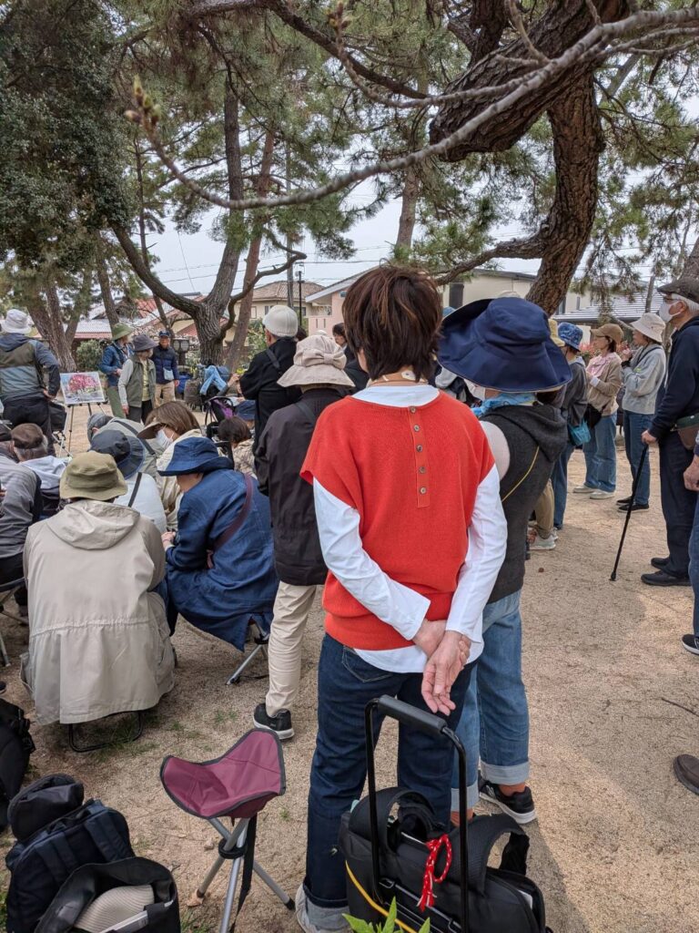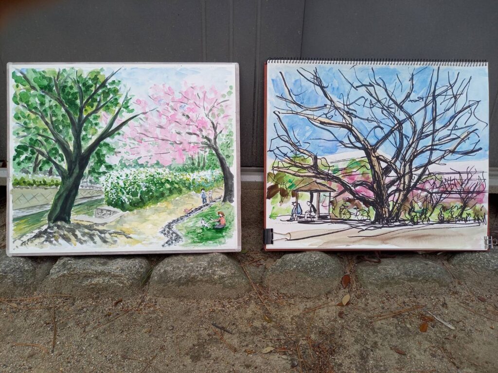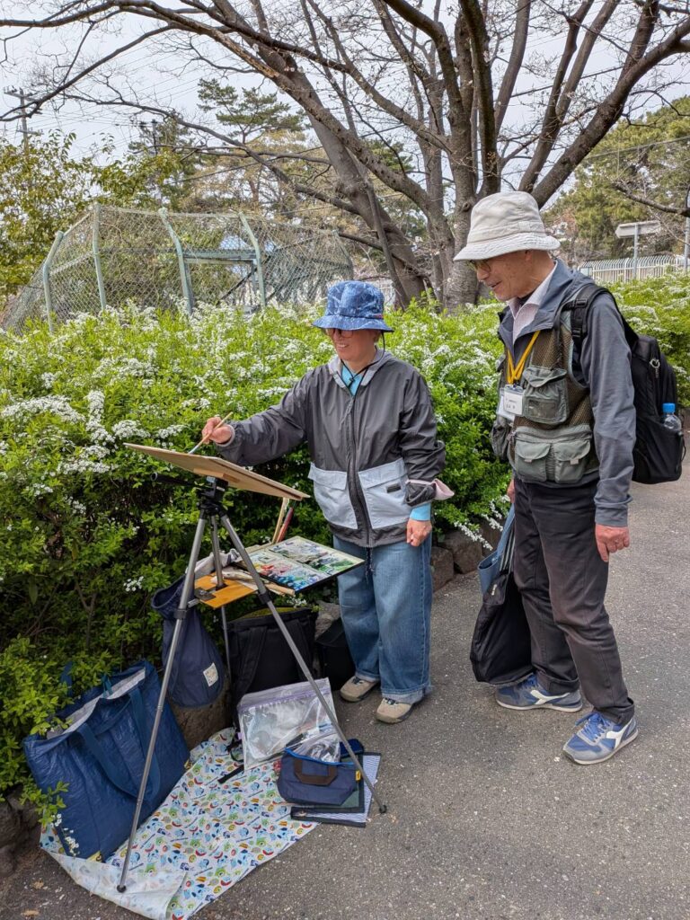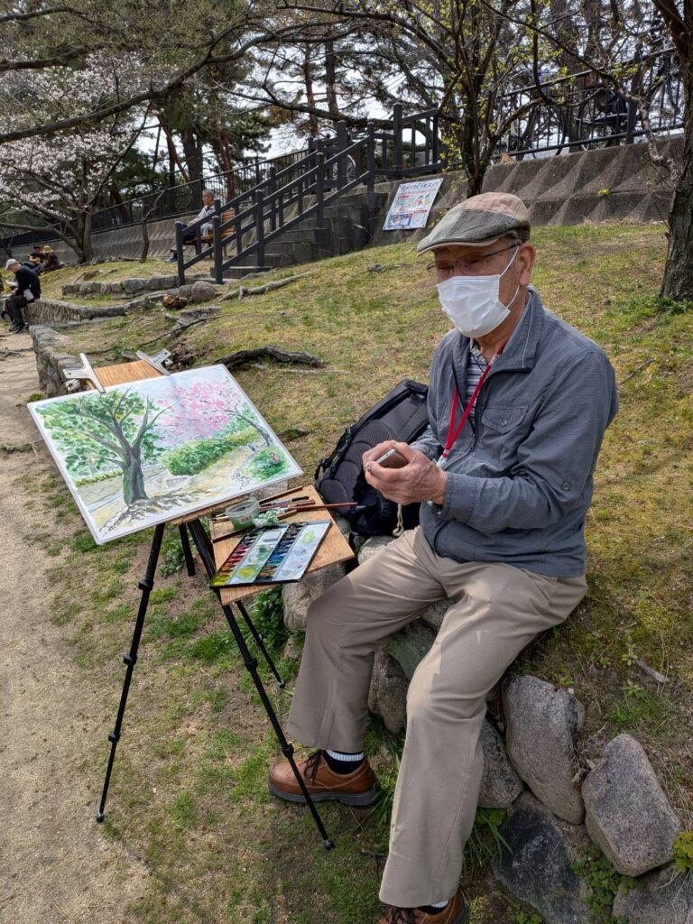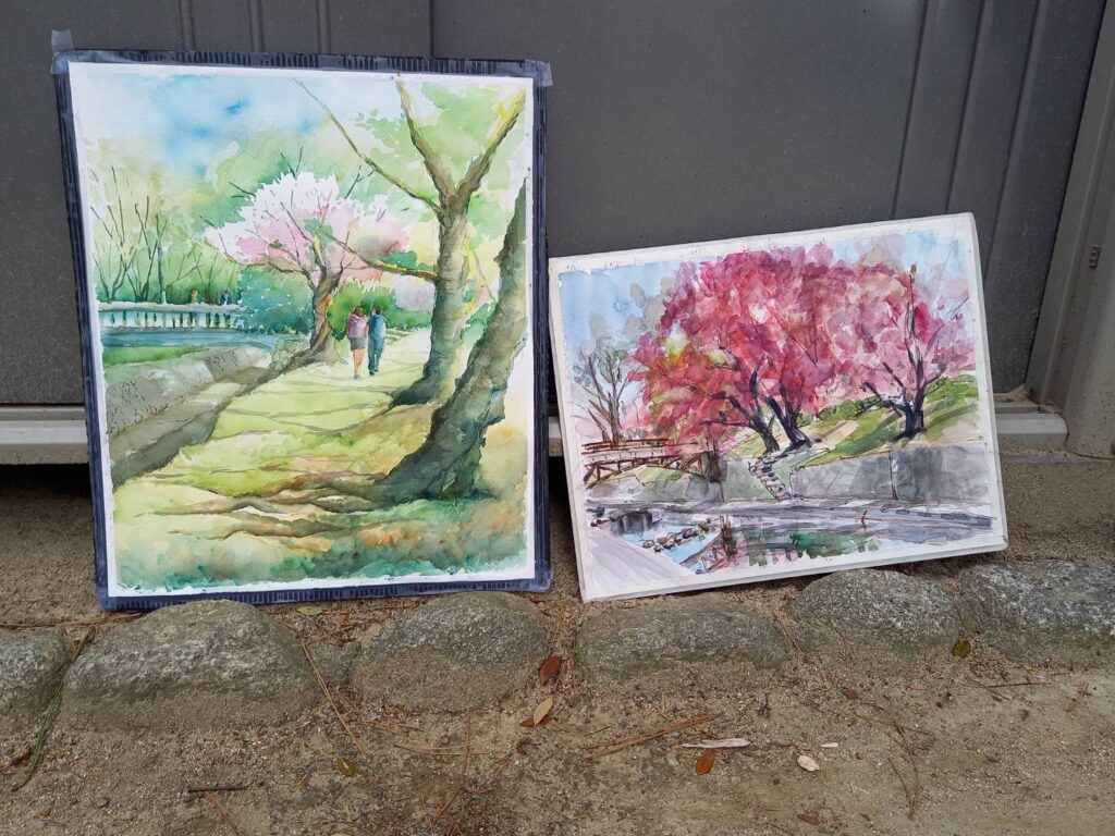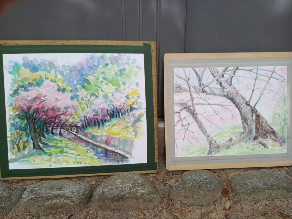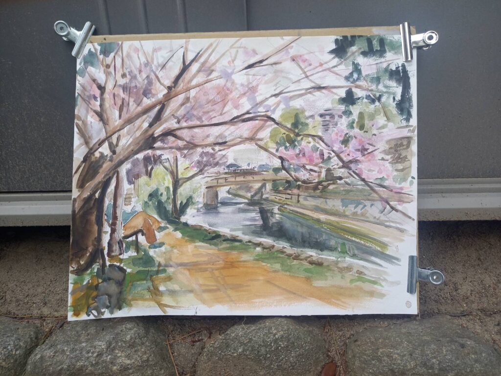 ニ、三日の好天で桜の開花も進み5分咲きと言ったところでしょうか。多くの参加者がここ香櫨園に集まりました。遠くは徳島からもいらしてくださり(2度目)総勢64名。花見客もさほど多くなく、迷惑かけないでスケッチを楽しめました。アドバイザーさんお疲れ様でした。