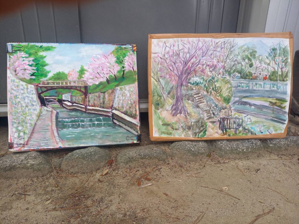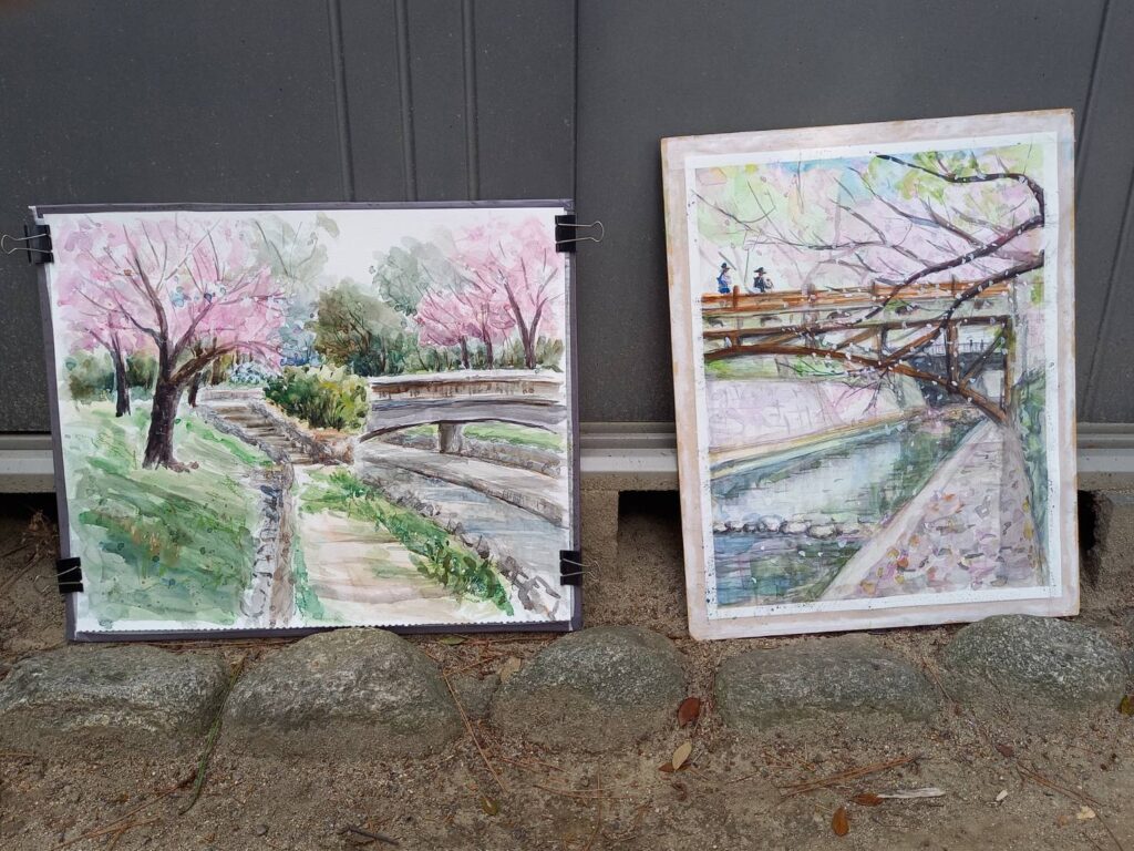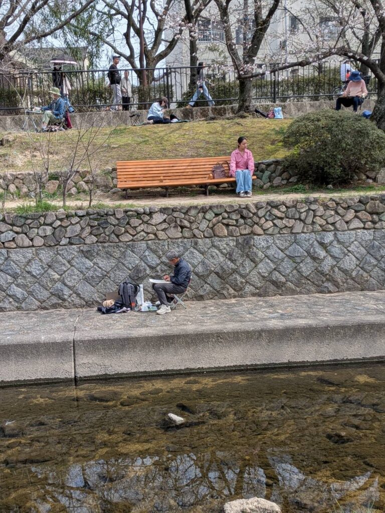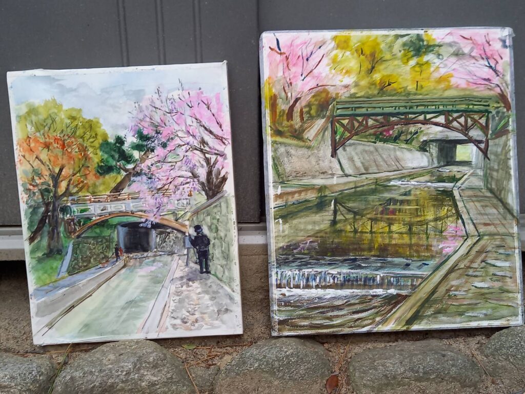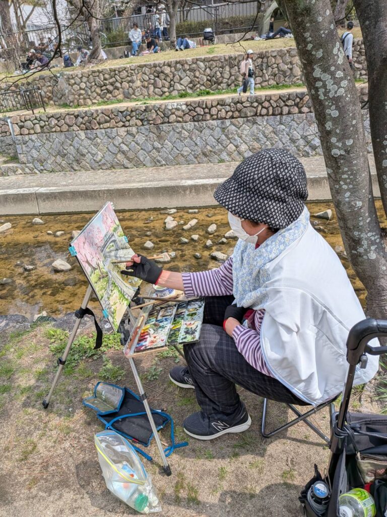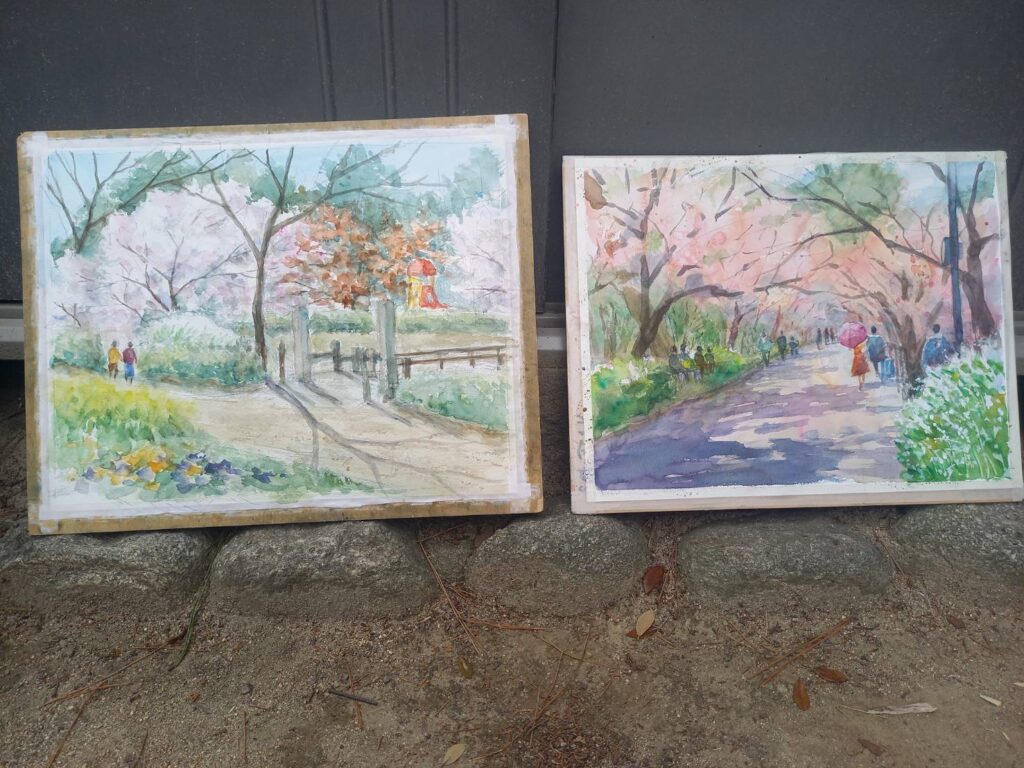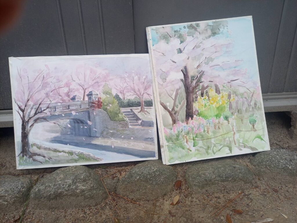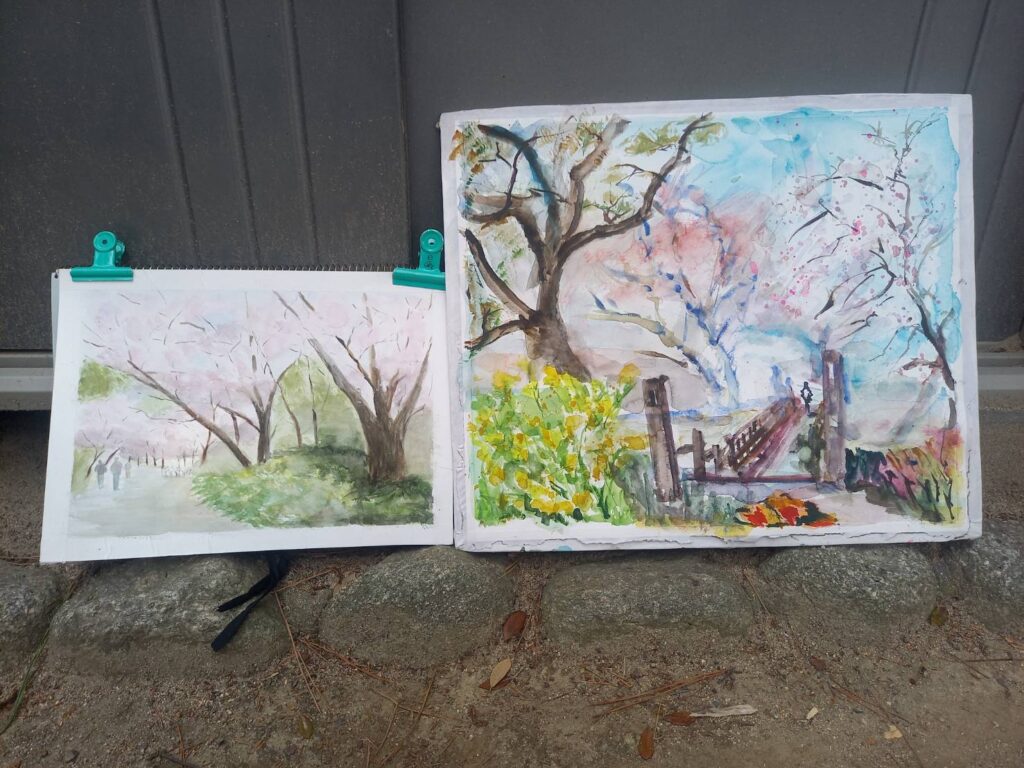ニ、三日の好天で桜の開花も進み5分咲きと言ったところでしょうか。多くの参加者がここ香櫨園に集まりました。遠くは徳島からもいらしてくださり(2度目)総勢64名。花見客もさほど多くなく、迷惑かけないでスケッチを楽しめました。アドバイザーさんお疲れ様でした。