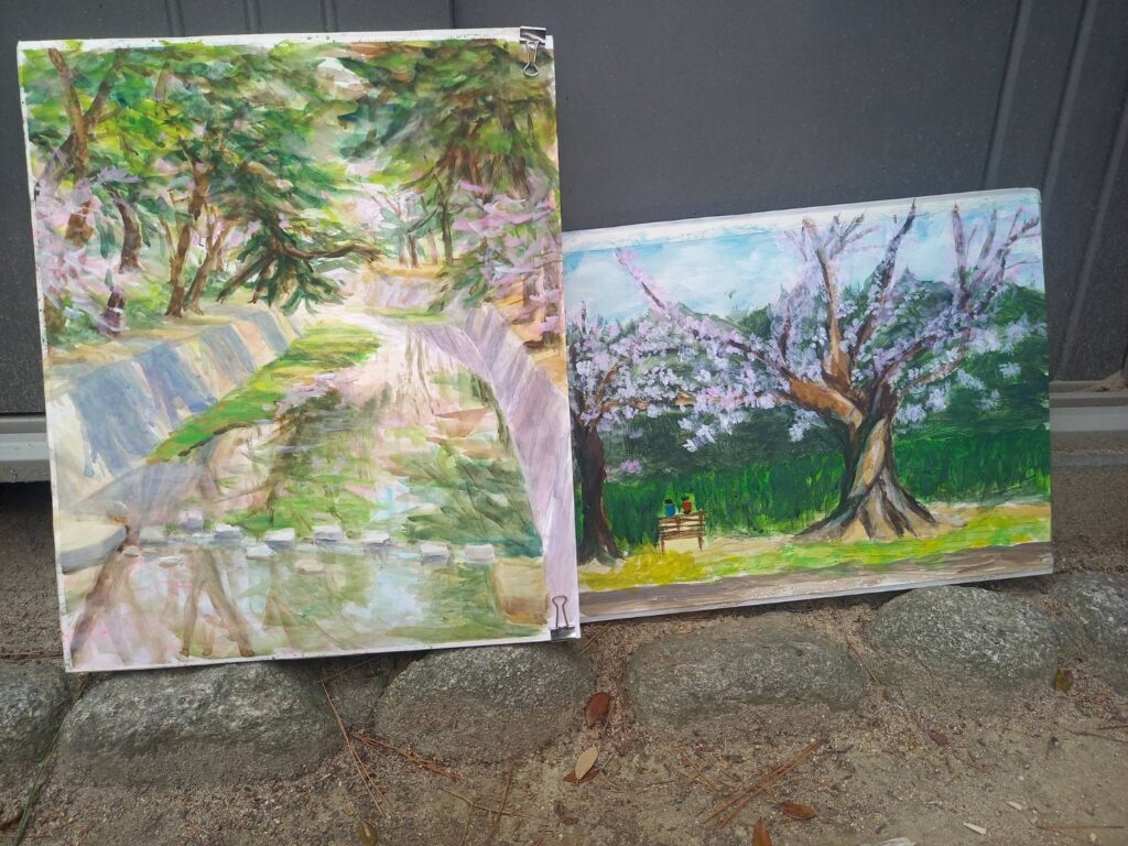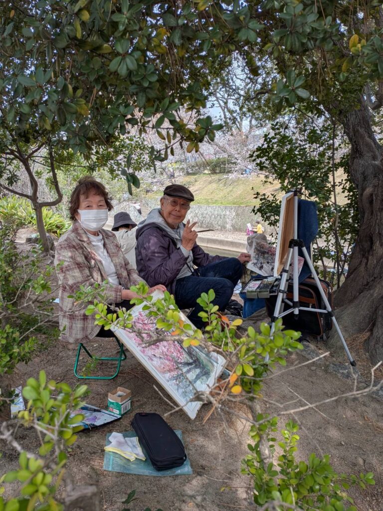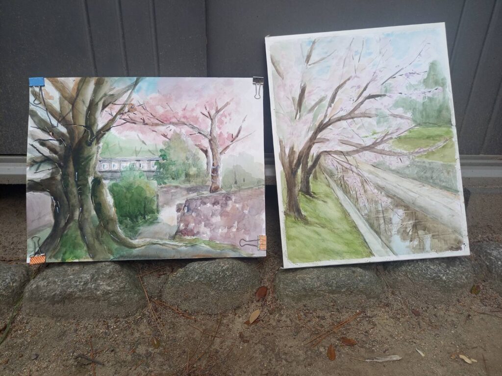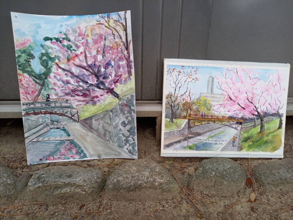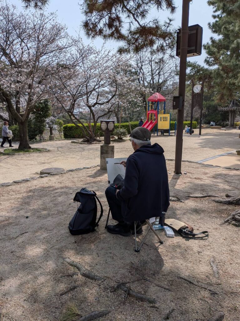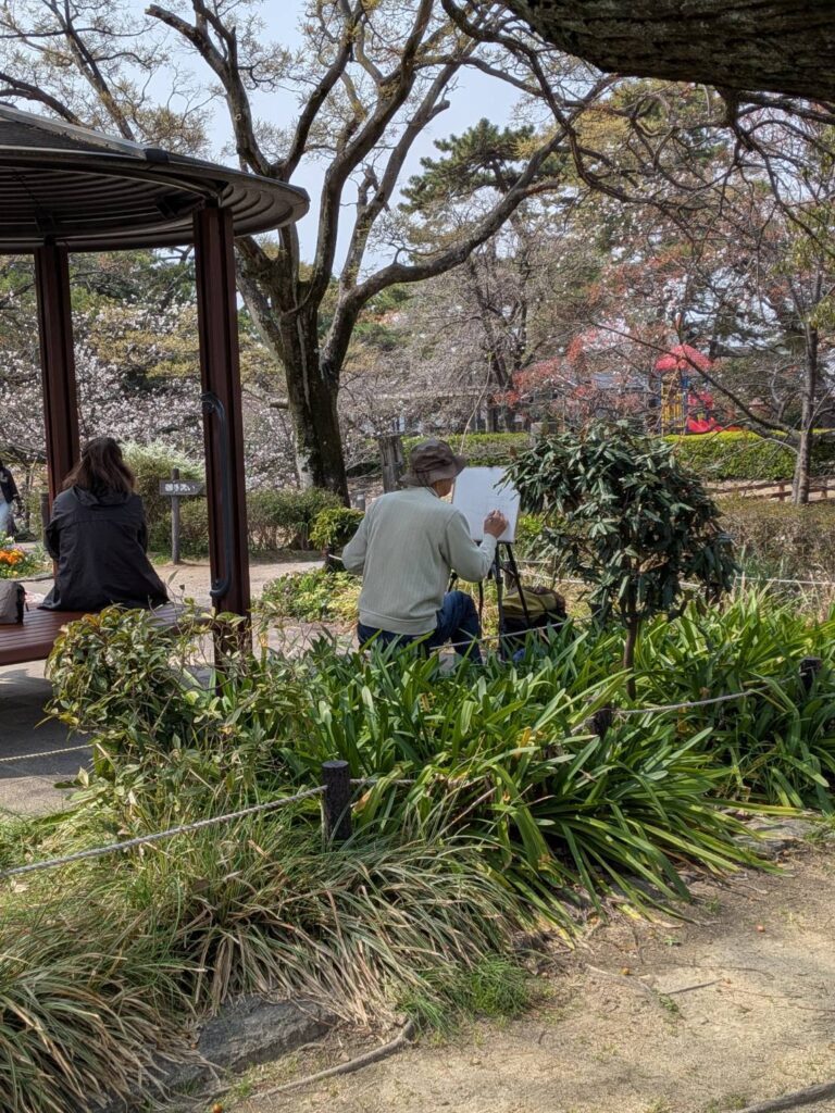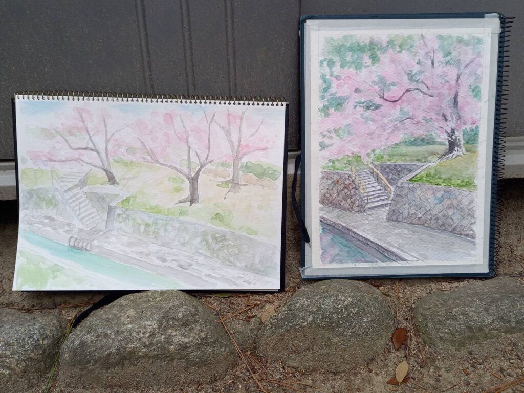 ニ、三日の好天で桜の開花も進み5分咲きと言ったところでしょうか。多くの参加者がここ香櫨園に集まりました。遠くは徳島からもいらしてくださり(2度目)総勢64名。花見客もさほど多くなく、迷惑かけないでスケッチを楽しめました。アドバイザーさんお疲れ様でした。
