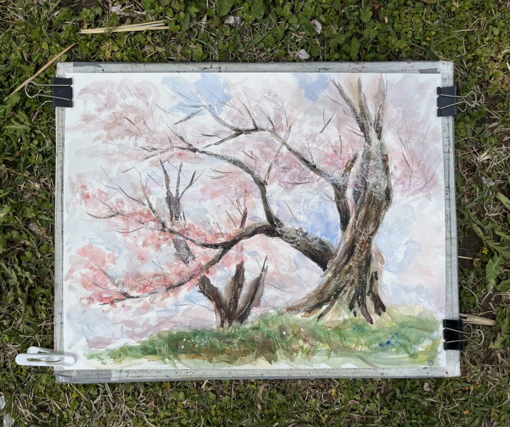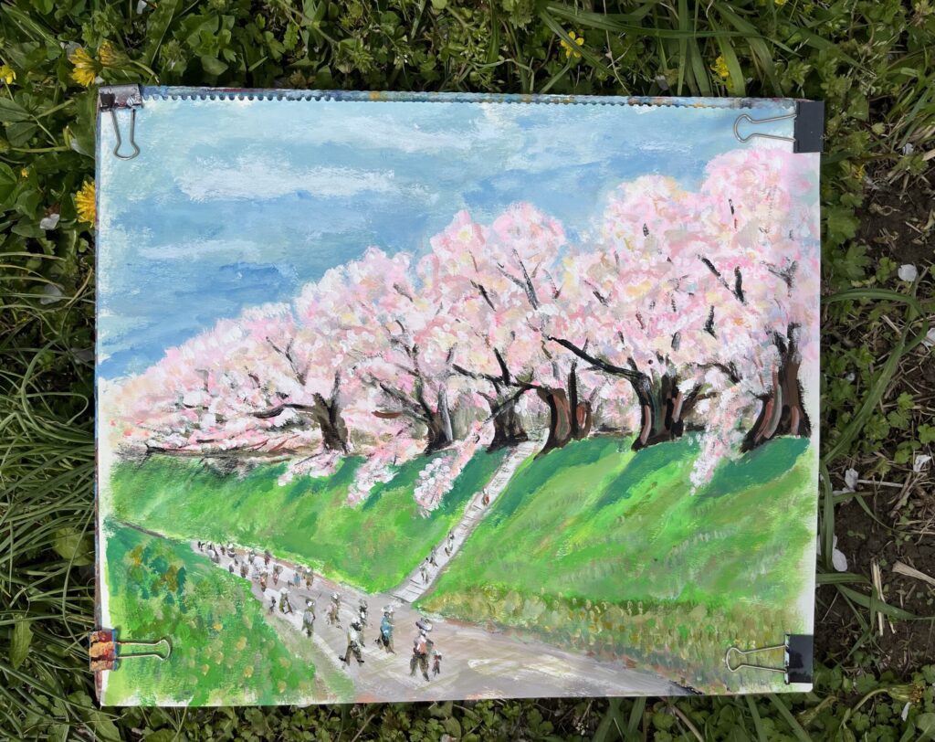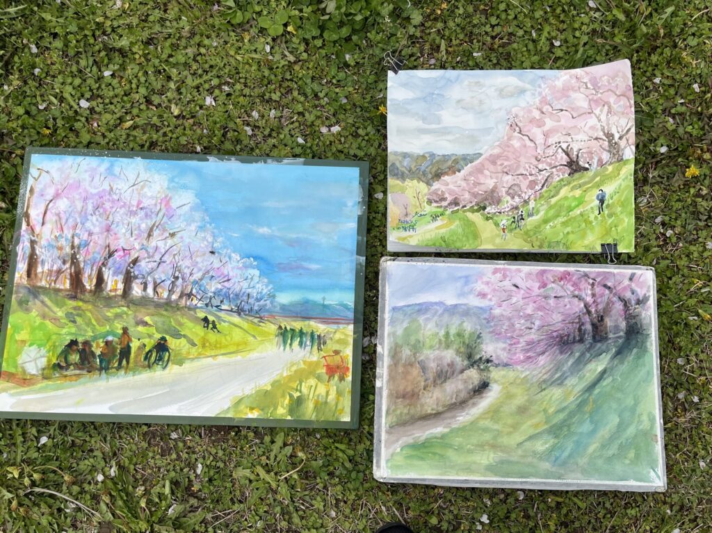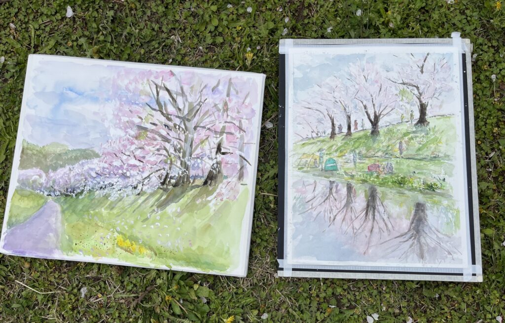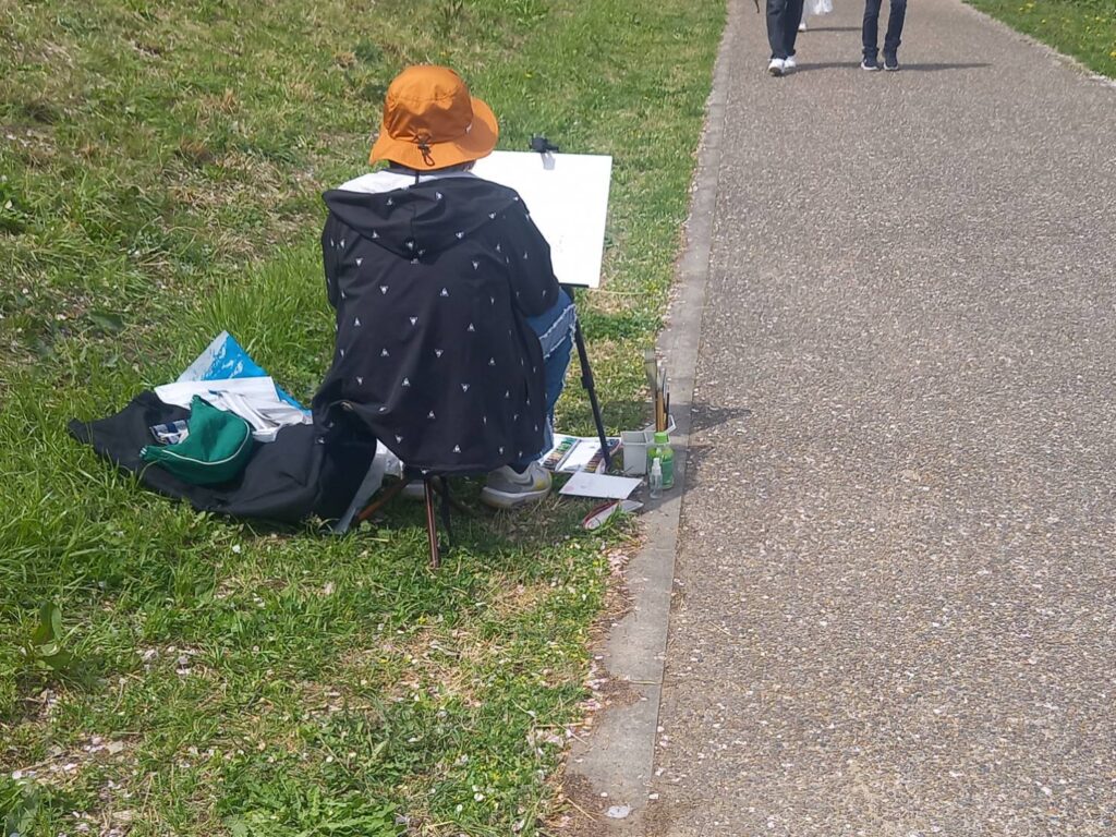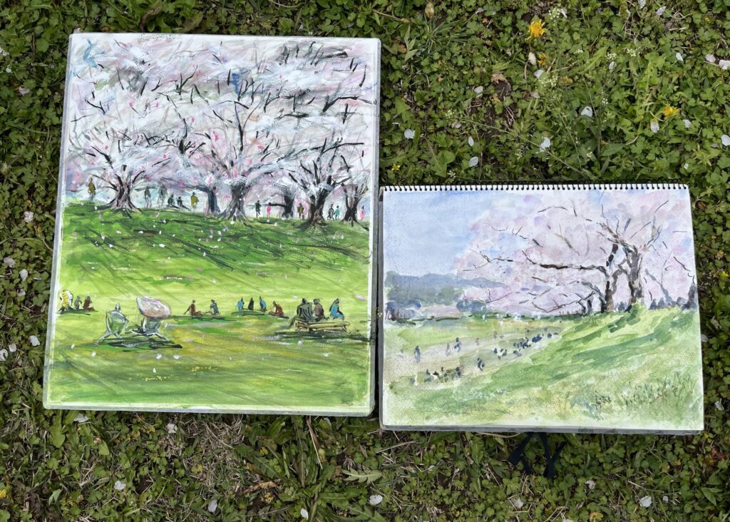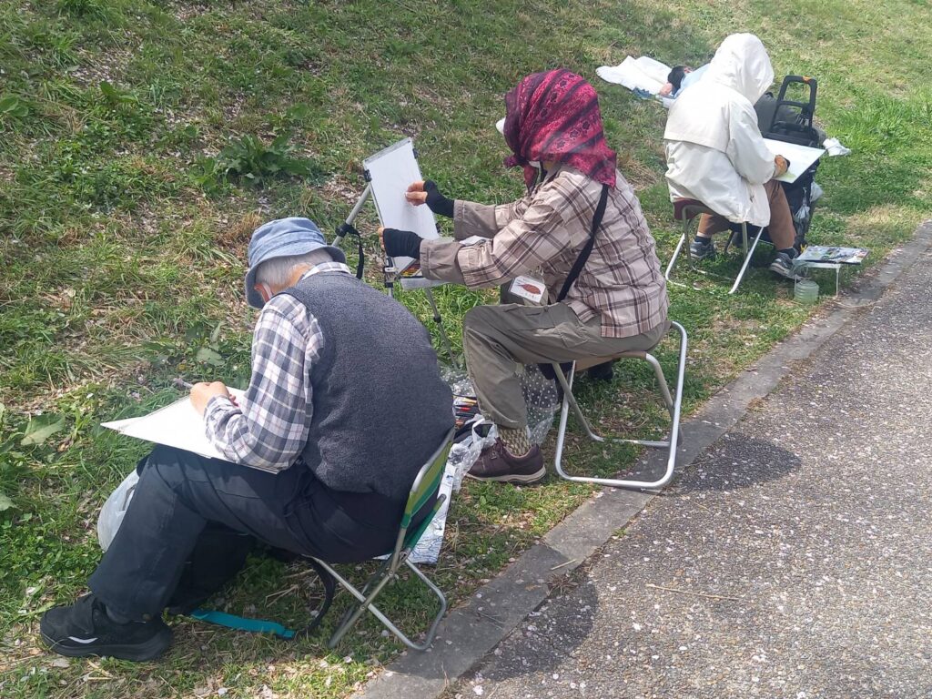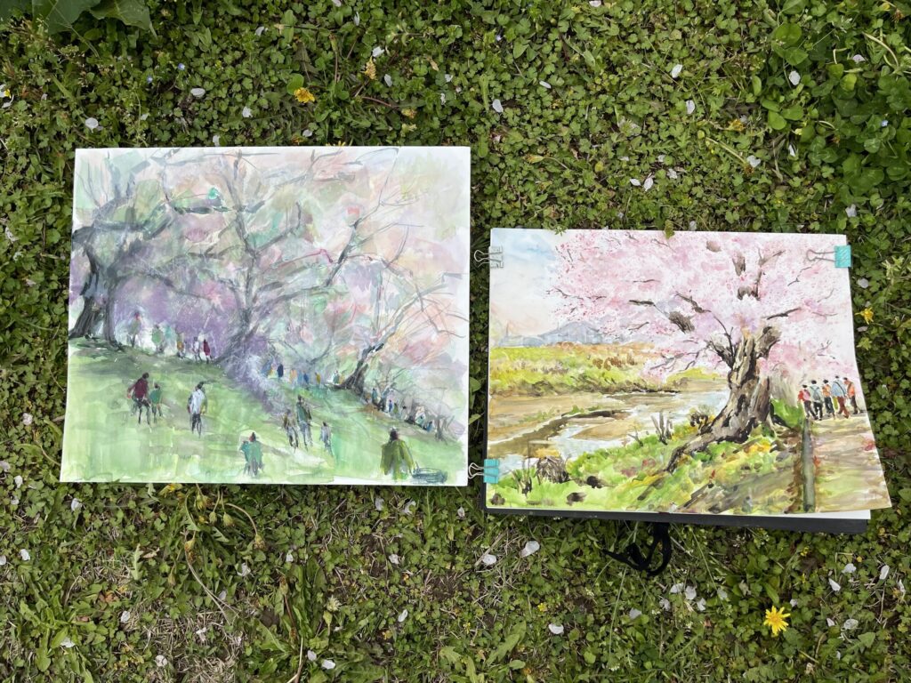 前夜の雨がきれいに上がり、絶好のお花見&スケッチ日和。桜並木を散策する人、お弁当を広げるファミリーとどこまで行っても人、人、人でたくさん歩きました。3名の方が新たに入会され36人でのスケッチ、お花見客の方にも見守られながらの講評会となりました。