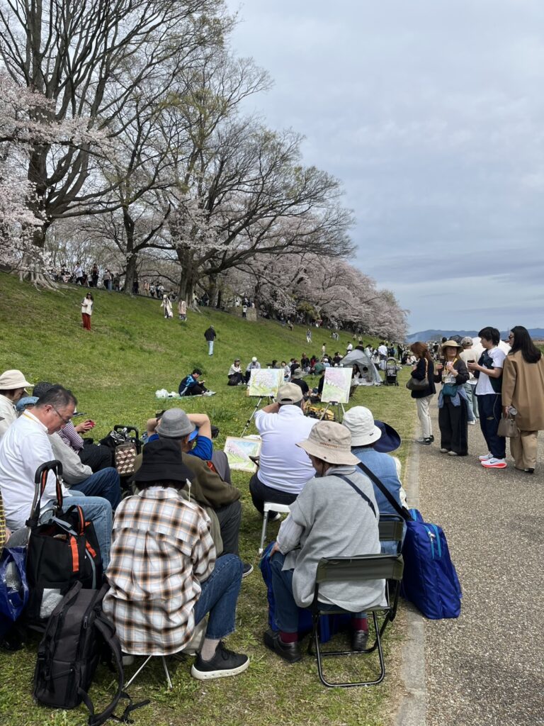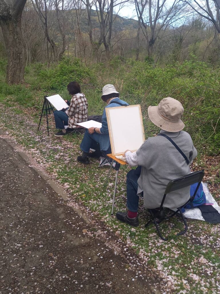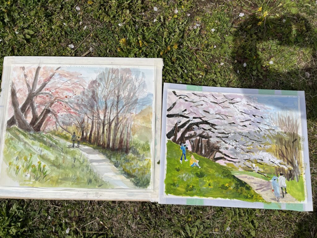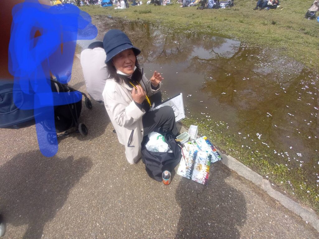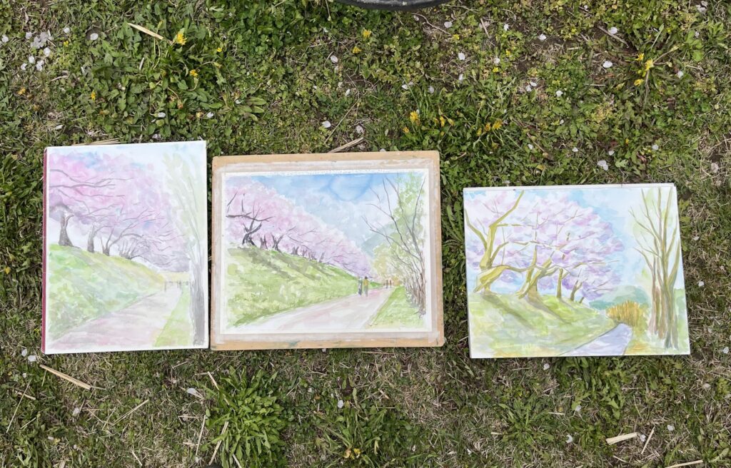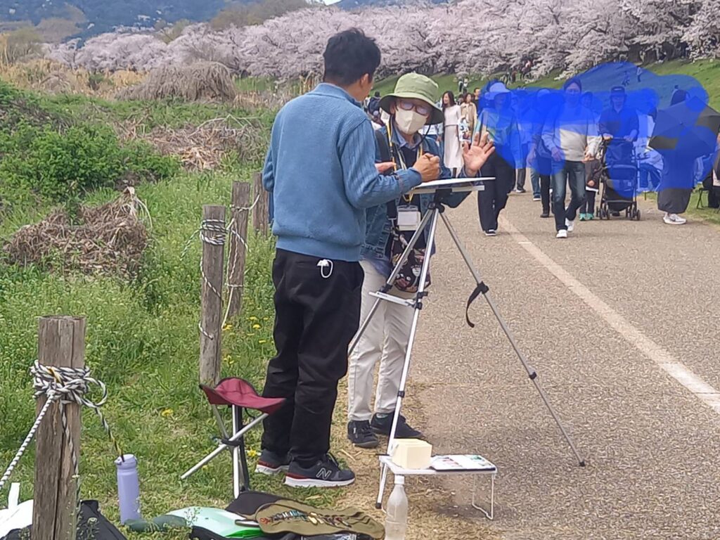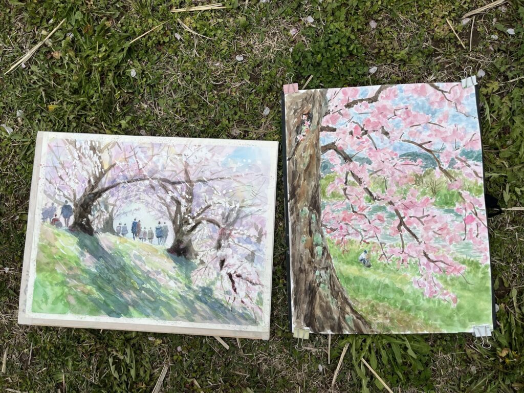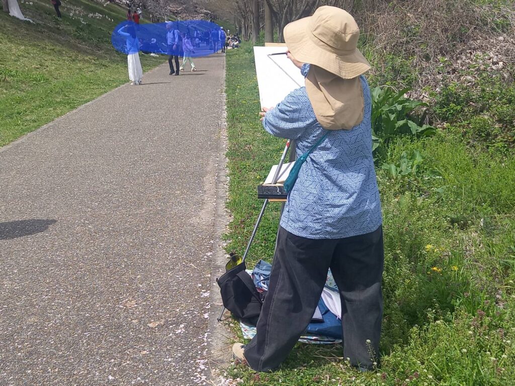 前夜の雨がきれいに上がり、絶好のお花見&スケッチ日和。桜並木を散策する人、お弁当を広げるファミリーとどこまで行っても人、人、人でたくさん歩きました。3名の方が新たに入会され36人でのスケッチ、お花見客の方にも見守られながらの講評会となりました。