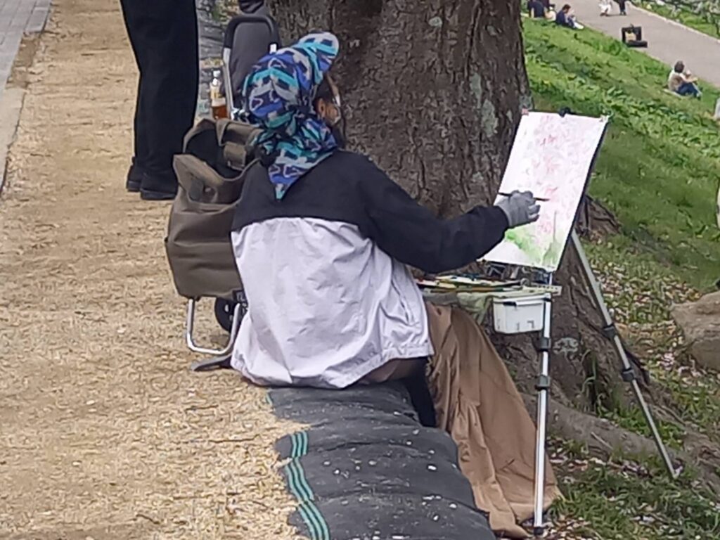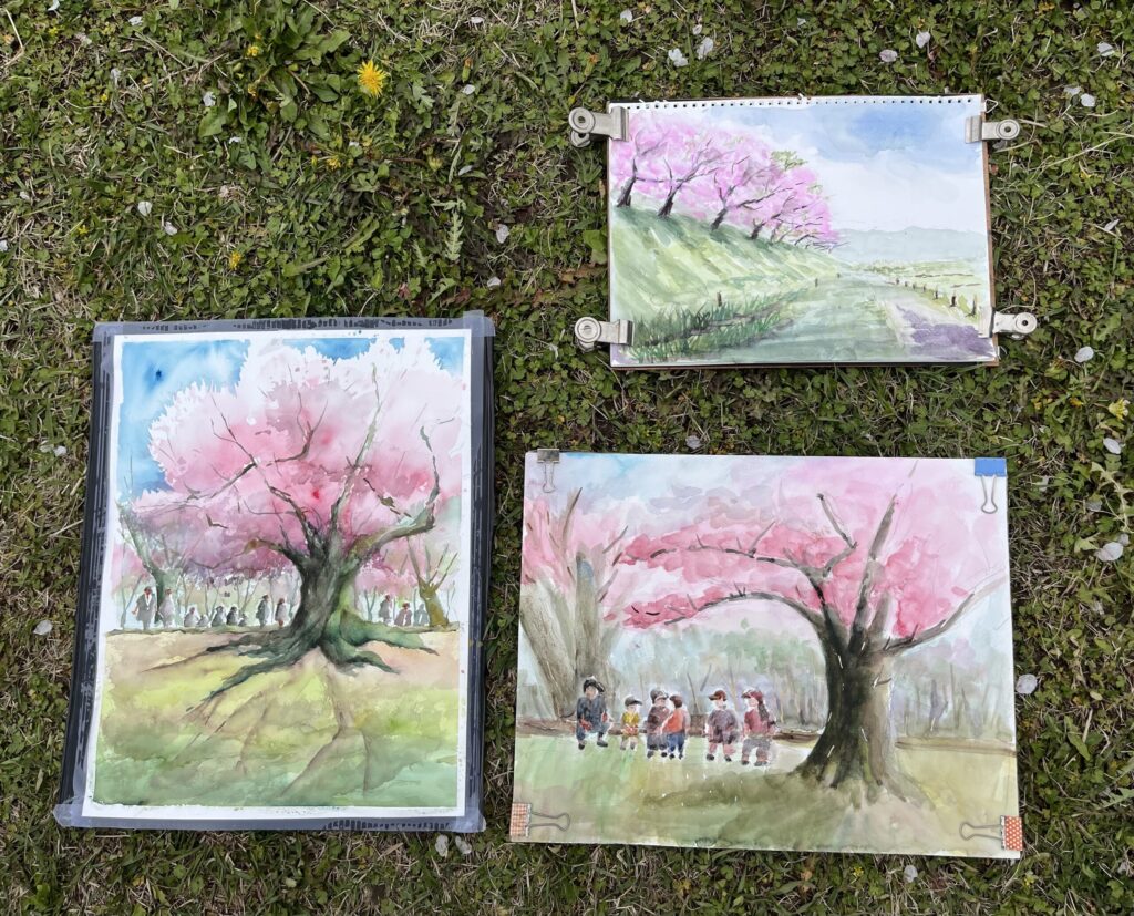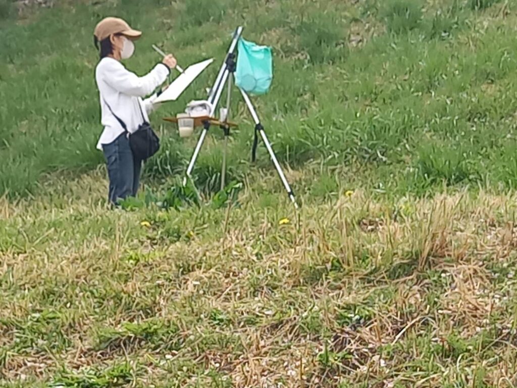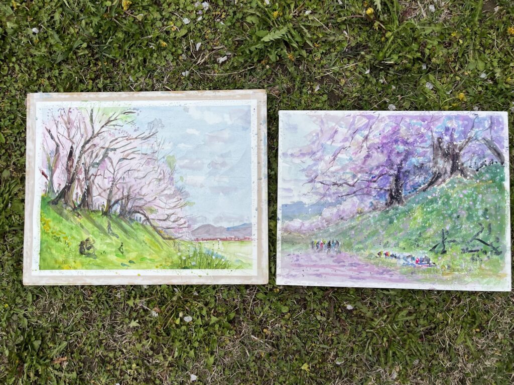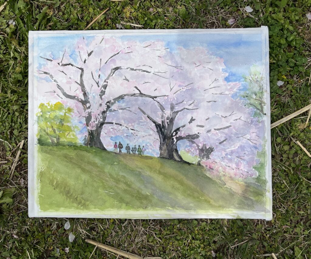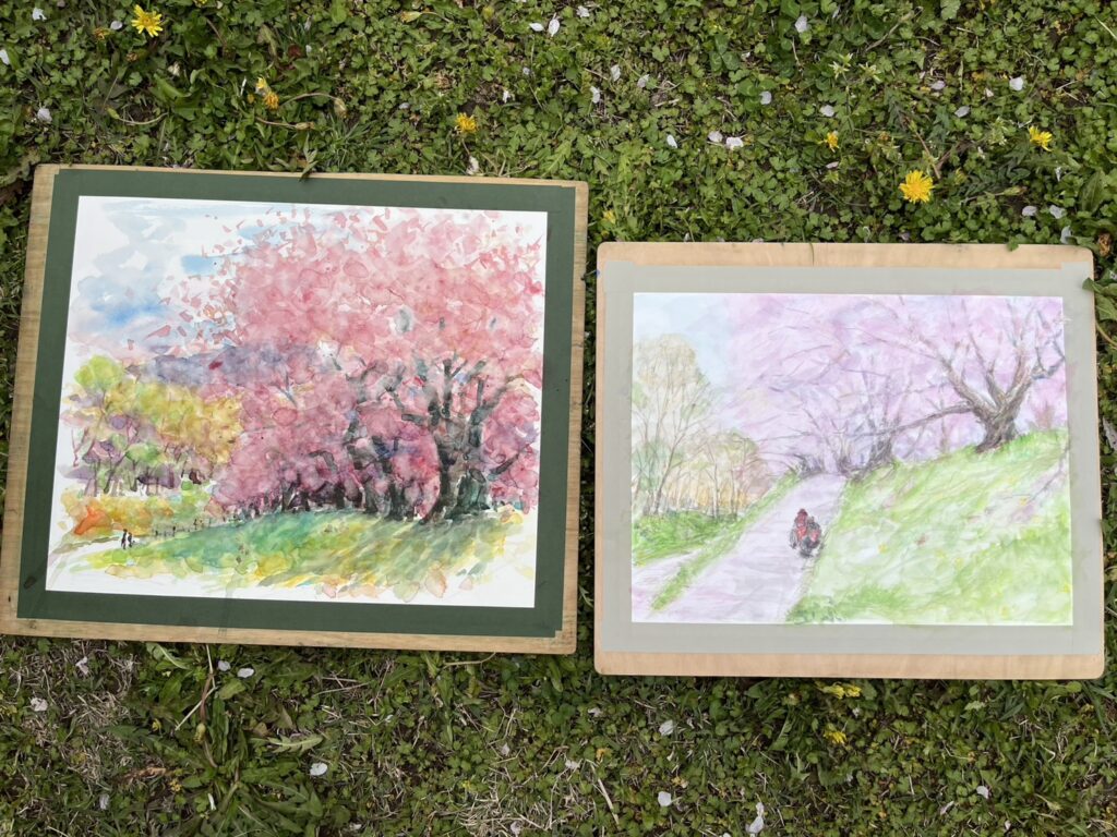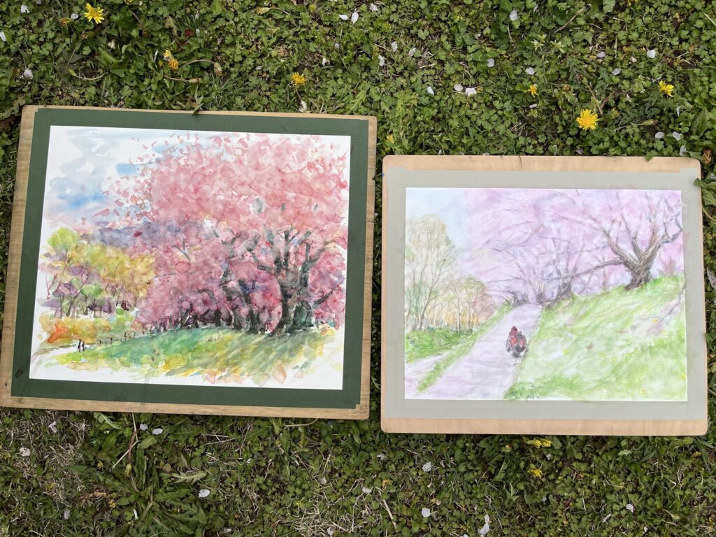 前夜の雨がきれいに上がり、絶好のお花見&スケッチ日和。桜並木を散策する人、お弁当を広げるファミリーとどこまで行っても人、人、人でたくさん歩きました。3名の方が新たに入会され36人でのスケッチ、お花見客の方にも見守られながらの講評会となりました。