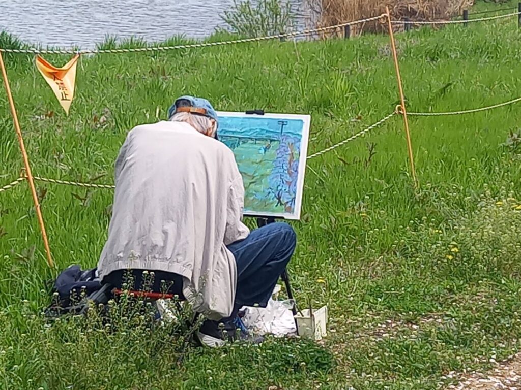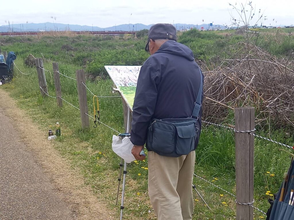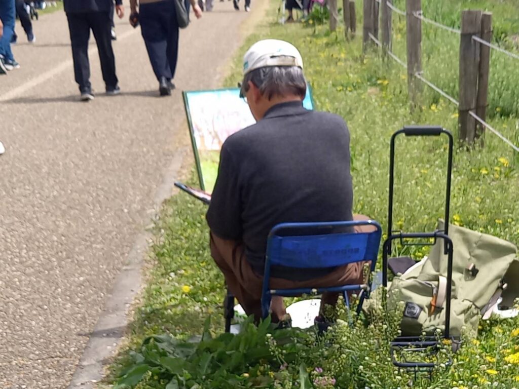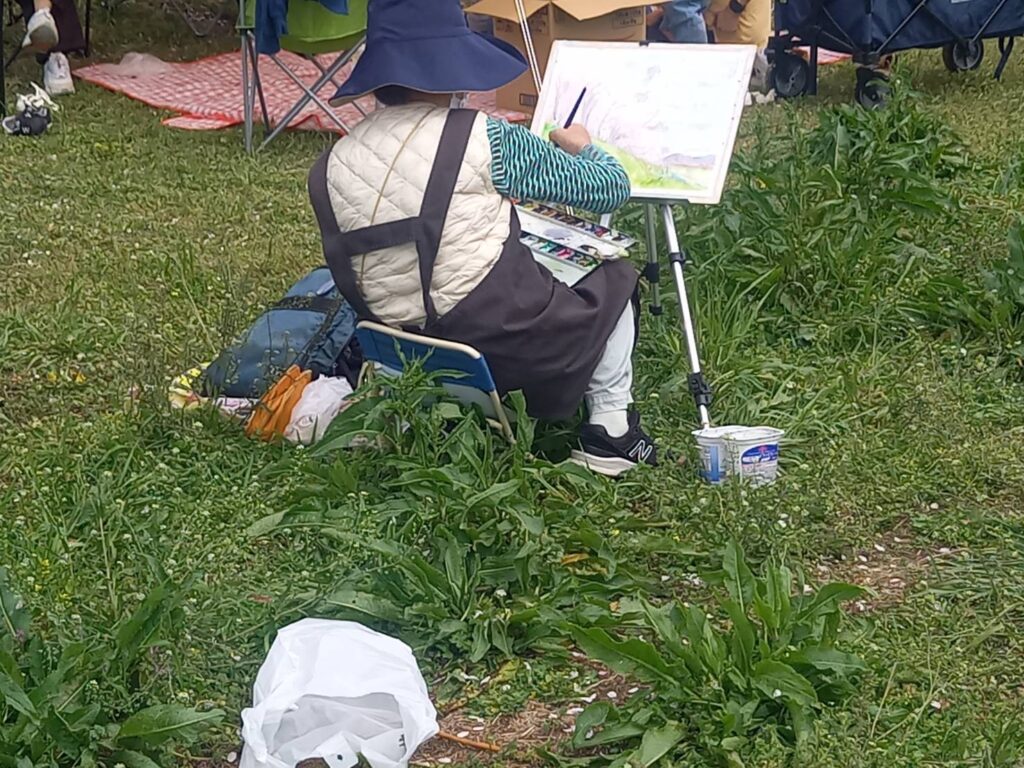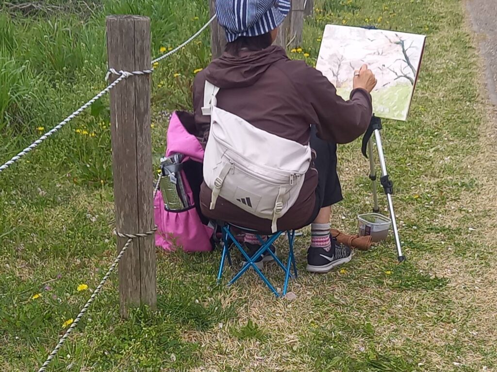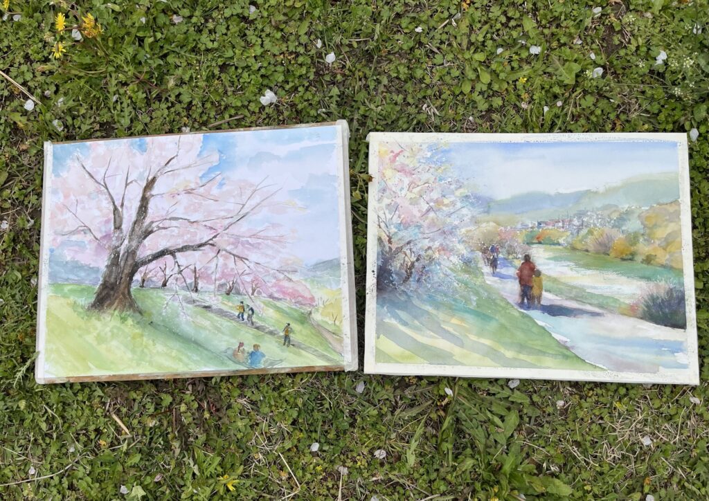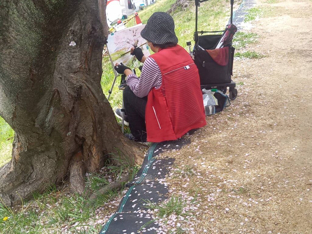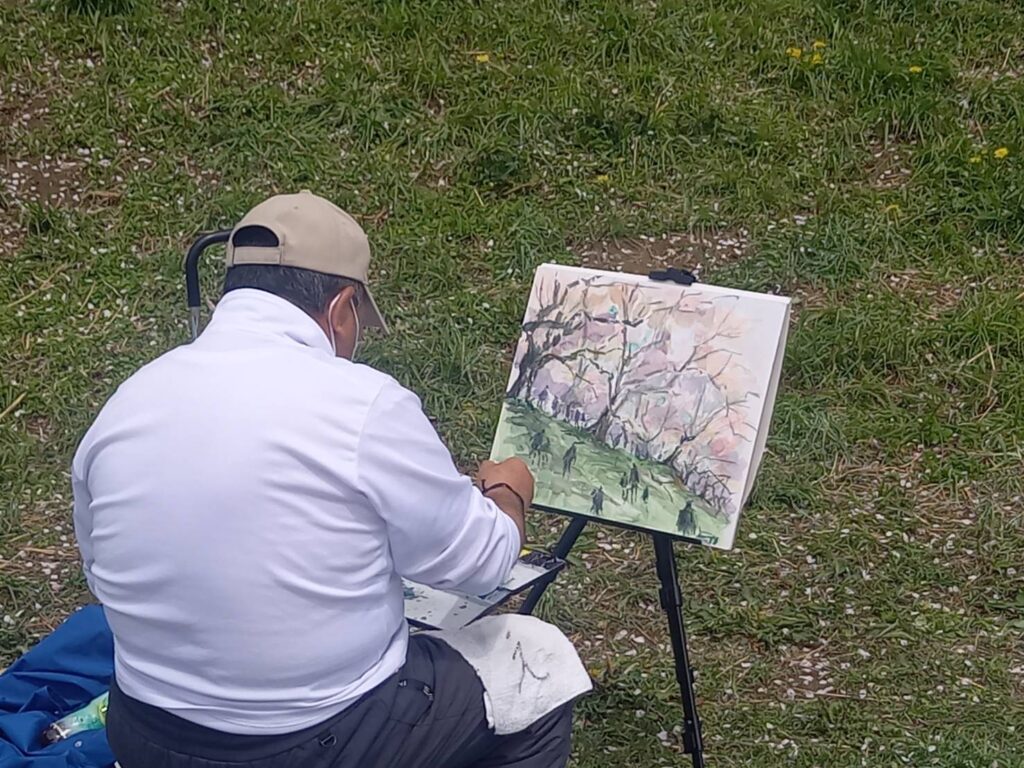 前夜の雨がきれいに上がり、絶好のお花見&スケッチ日和。桜並木を散策する人、お弁当を広げるファミリーとどこまで行っても人、人、人でたくさん歩きました。3名の方が新たに入会され36人でのスケッチ、お花見客の方にも見守られながらの講評会となりました。