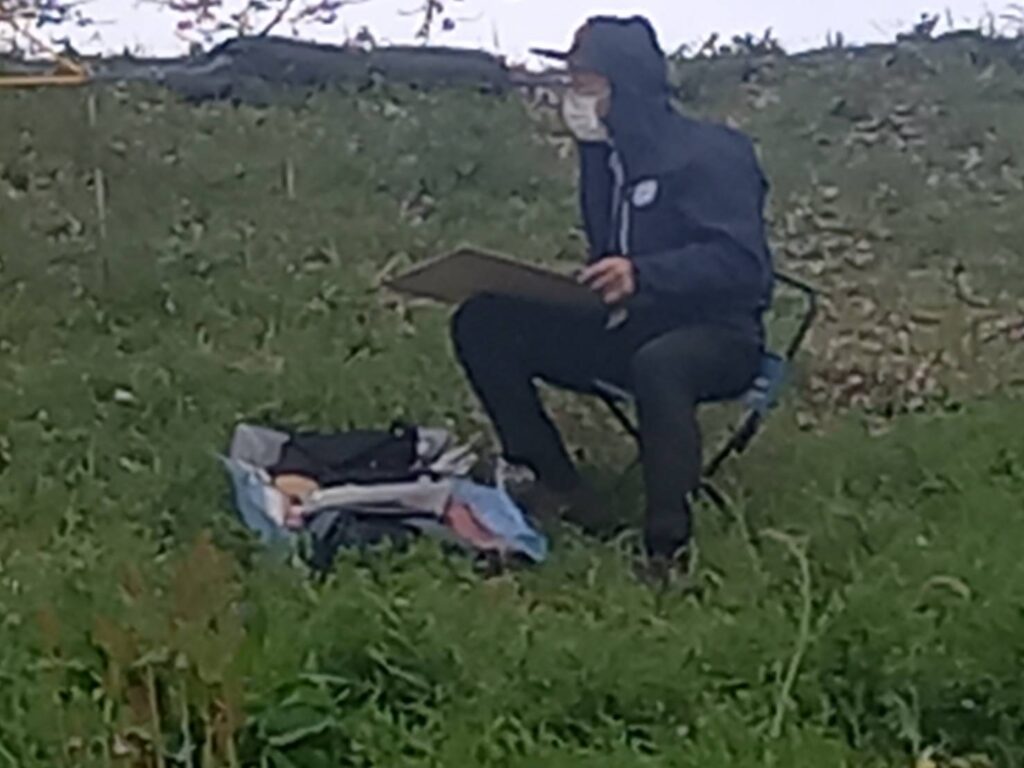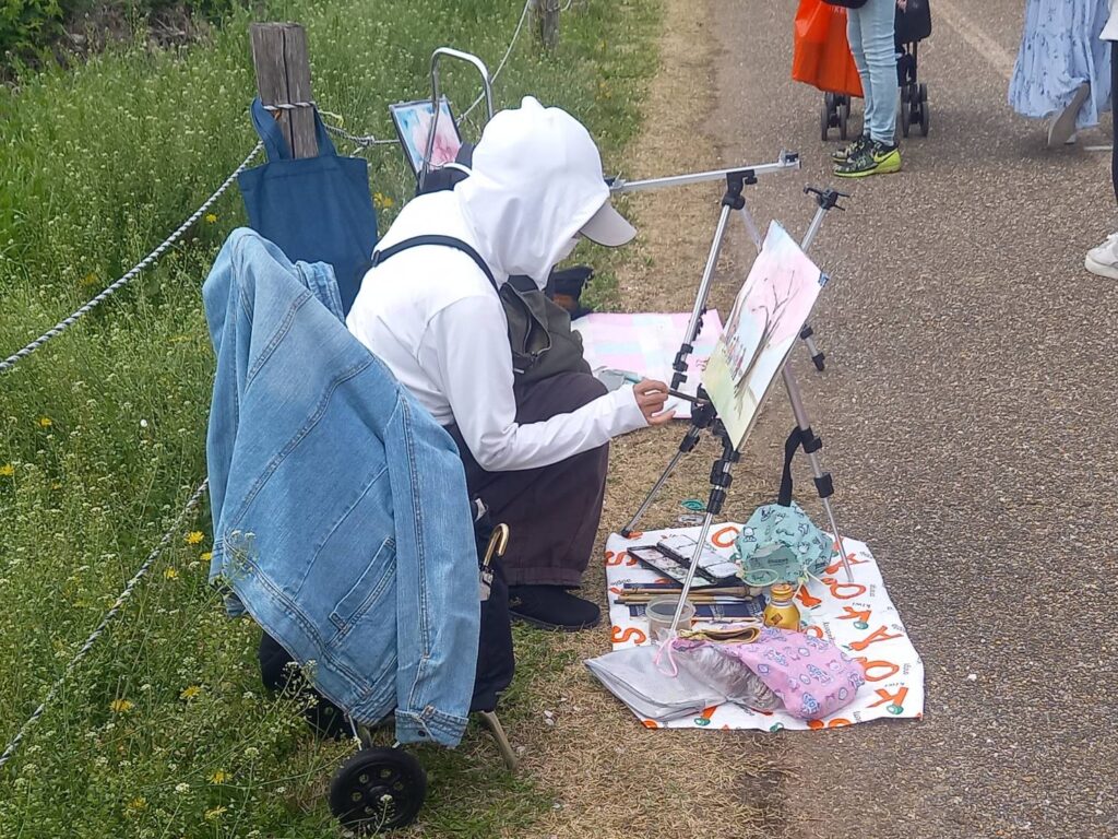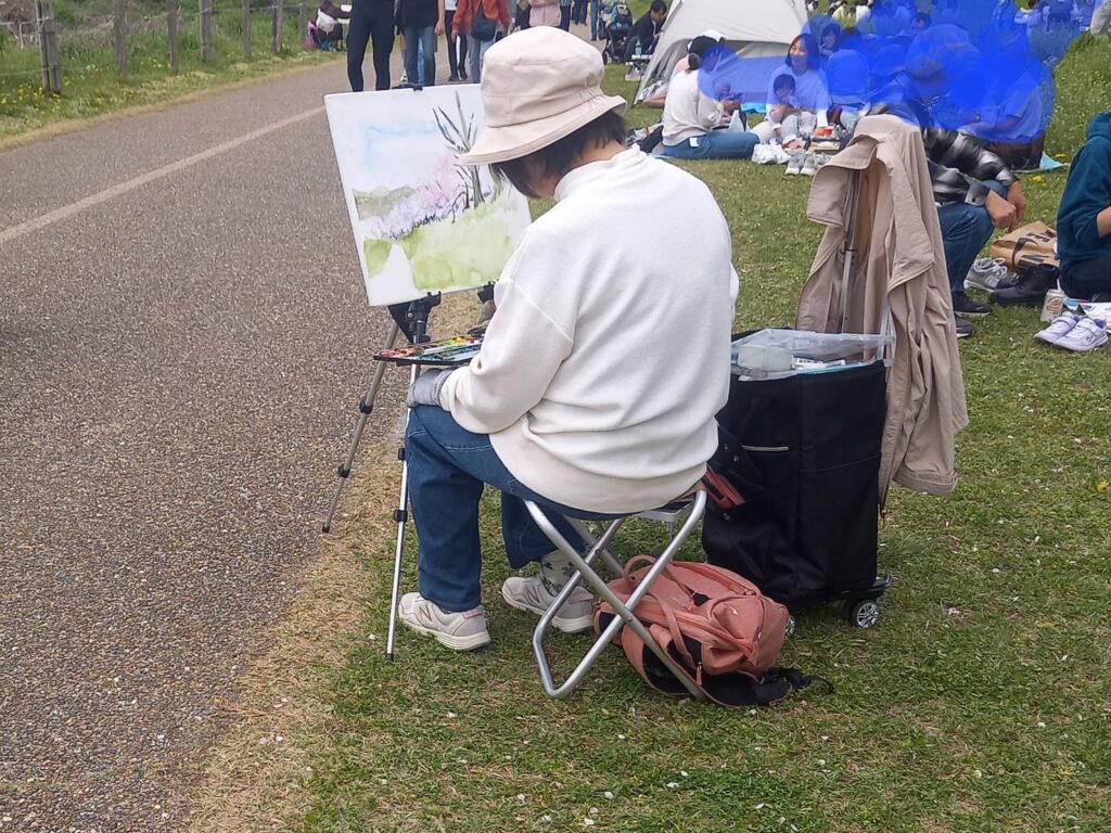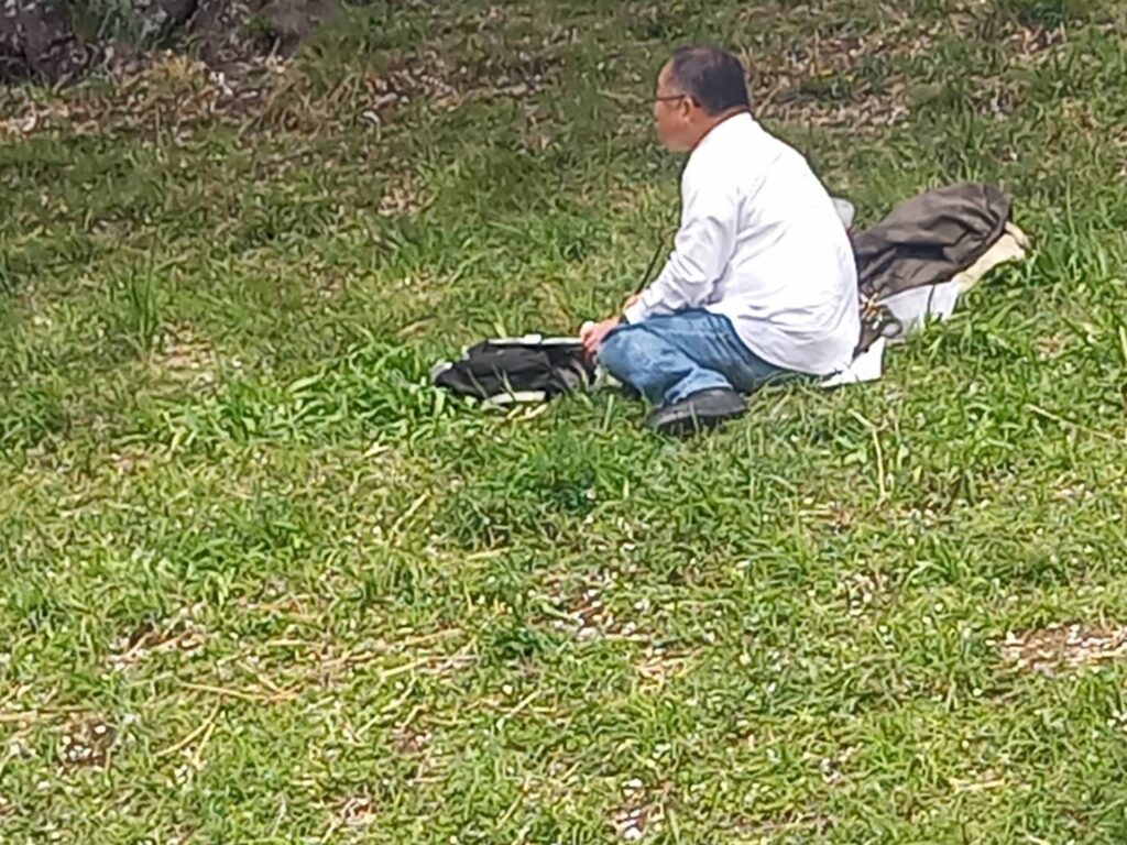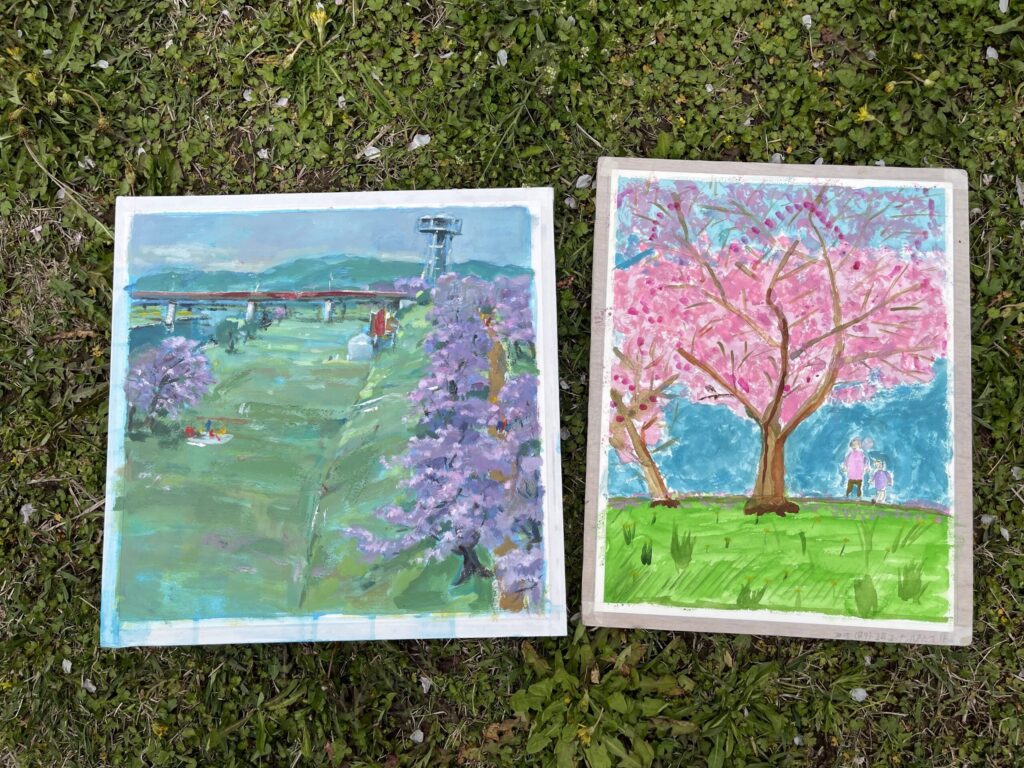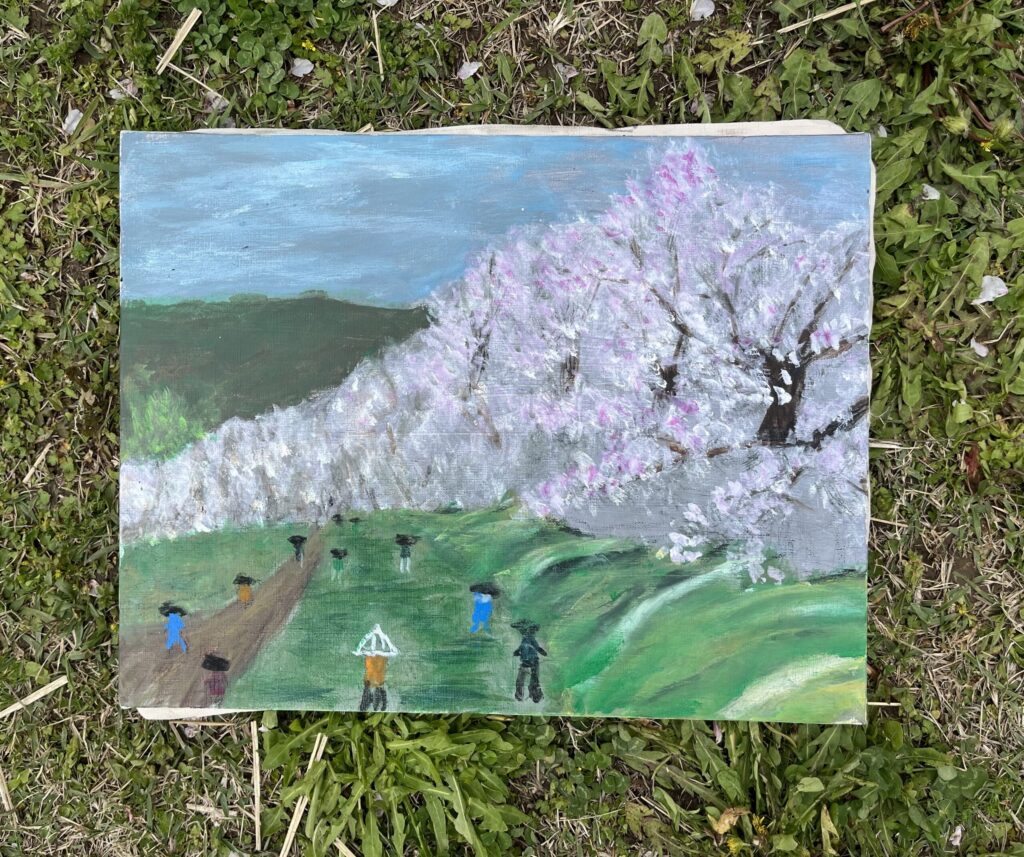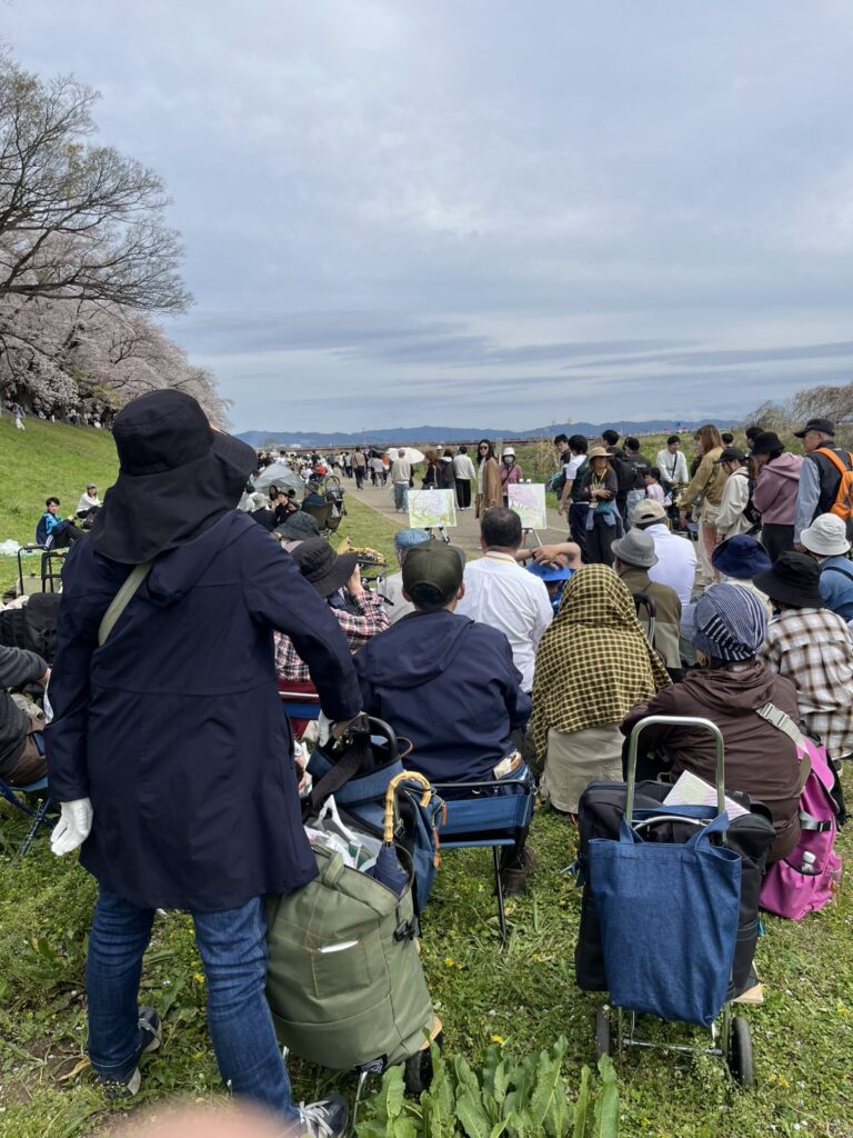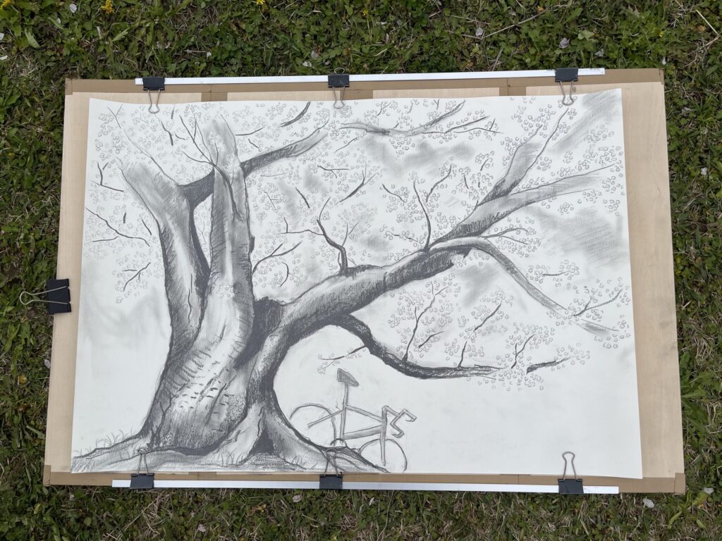 前夜の雨がきれいに上がり、絶好のお花見&スケッチ日和。桜並木を散策する人、お弁当を広げるファミリーとどこまで行っても人、人、人でたくさん歩きました。3名の方が新たに入会され36人でのスケッチ、お花見客の方にも見守られながらの講評会となりました。