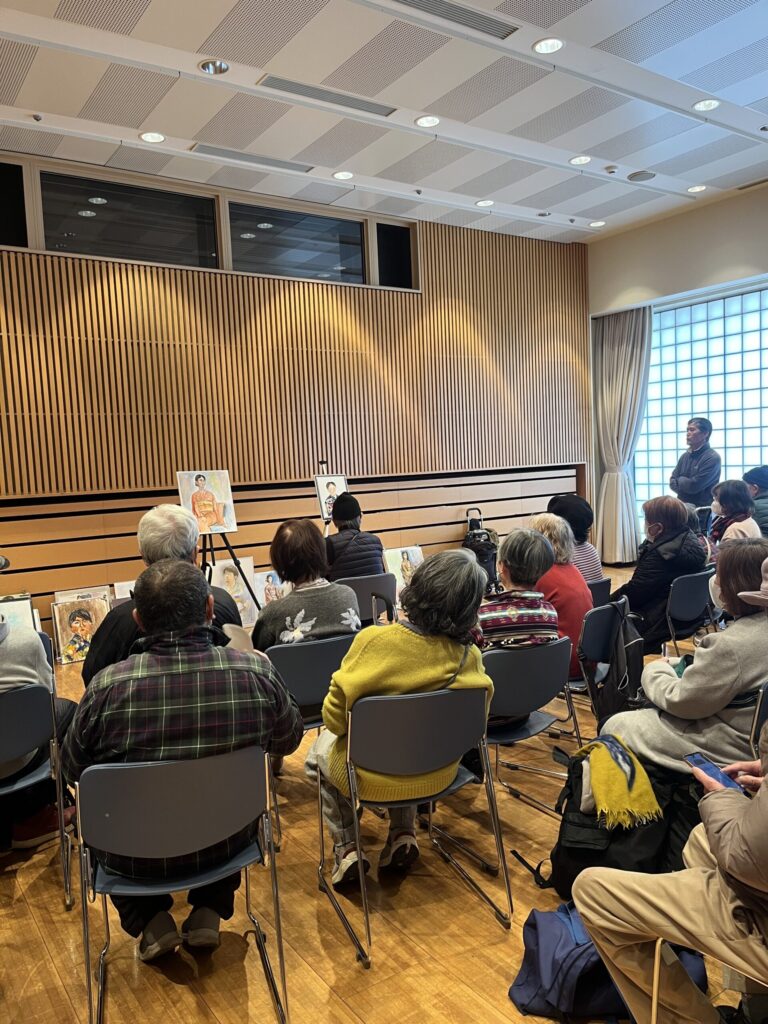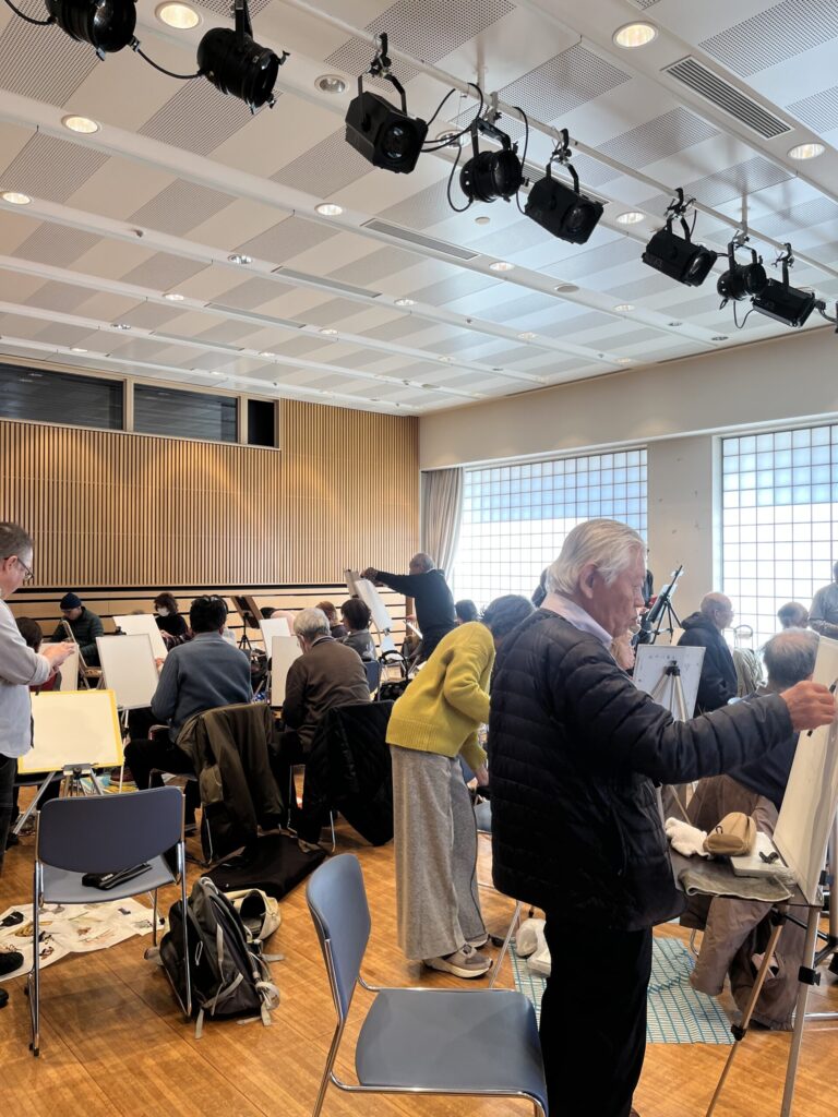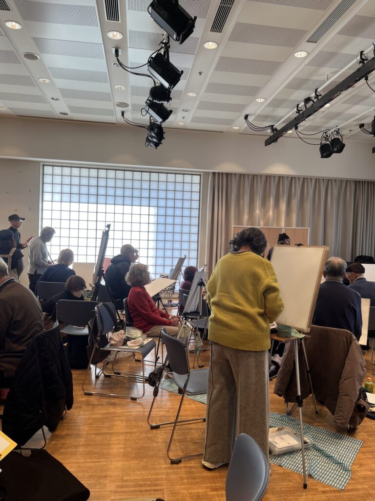 新年あけて初めての会は、屋内での人物写生会でした。外は猛烈な風が吹きすさんでいましたが、室内は熱気ムンムン、やる気マンマンの41名の会員で本年もスタートしました。