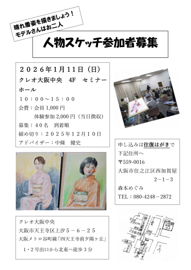 お知らせ|参加者募集|人物画|人物写生会|女性を描く|着衣:着物・晴れ着|クロッキー|2026年1月
