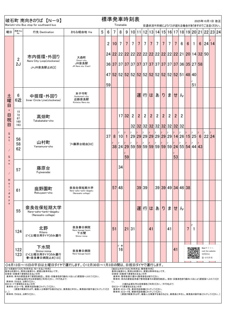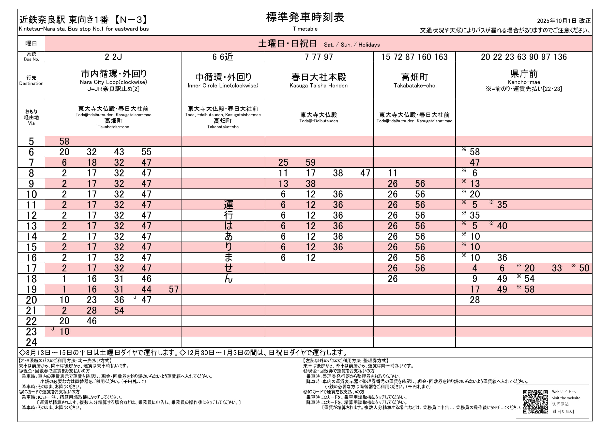 【バスの方】は近鉄奈良駅の5番出口を上がり、奈良交通バス1番乗り場から乗車して【破石町(わりいしちょう)】で下車してください。バスの所要時間は10分、料金は250円です。