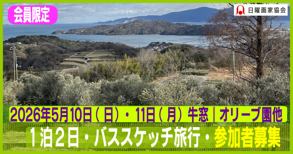 2026年5月10日(日)~2026年5月11日(月)日曜画家協会スケッチ会は「岡山県|牛窓|オリーブ園|ヨットハーバー」バススケッチ旅行、申込締切・3月25日先着順です ぜひご参加ください!スケッチ旅行へ一緒に出かけましょう。日常では出会えない景色に感動!そしてスケッチできる喜び!仲間とワイワイ話しながら楽しい時間をご一緒しましょう。講評会もあります。